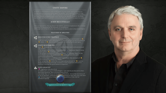 A parody mod that adds the Unity civilization with its Leader John Riccitello. Playing as him gives you: - Unique neighborhood district (Microtransactions Store) - Unique unit (Data Analyst) - Changes how great architects work for everyone on the match - Develops a unique system of obtaining gold via total number of civilizations met - And much more!