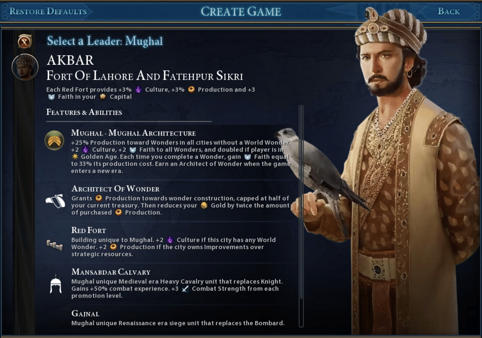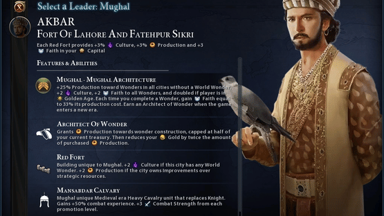 A mod that adds the Mughal civilization with its Leader Akbar. Playing as him gives you: - Unique units (Gajnal & Mansabdar Cavalry) - Unique great person (Architect of Wonder) - Unique building (Red Fort) - And much more!
