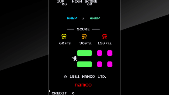 "WARP & WARP" is an action game released by NAMCO (Bandai Namco Entertainment Inc.) in 1981. Players travel between two worlds as they progress: a space world where they fight with guns, and a maze world where they fight with time bombs. Try for a high score by taking down the MYSTERY BEM that spawn under set conditions, or by taking out multiple enemies with a single explosion!