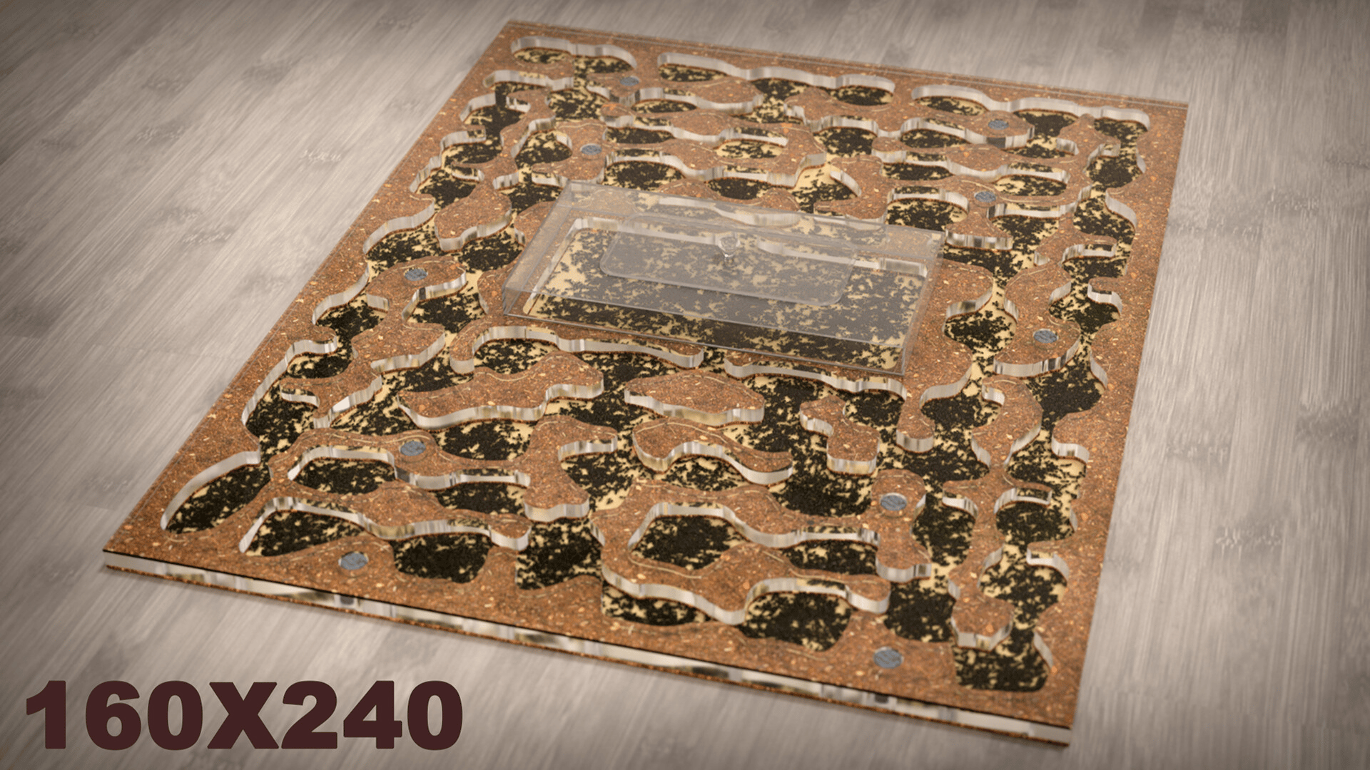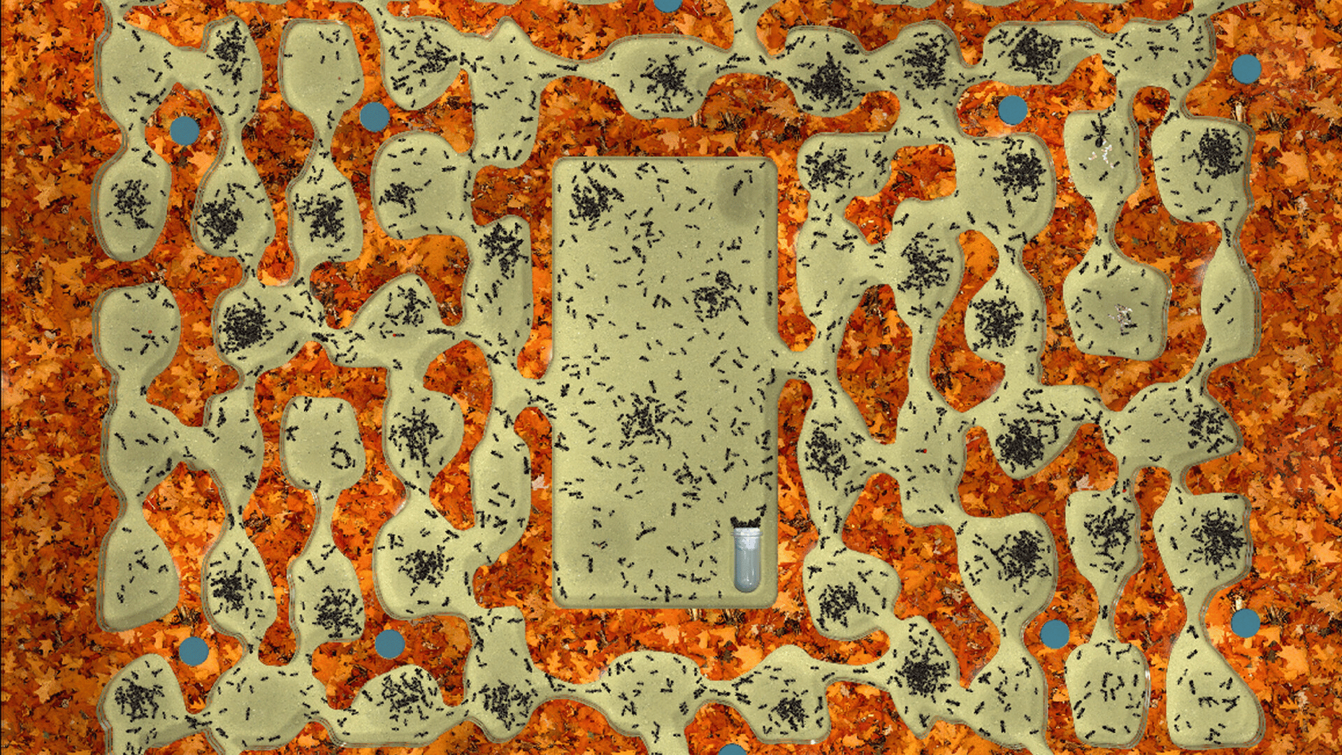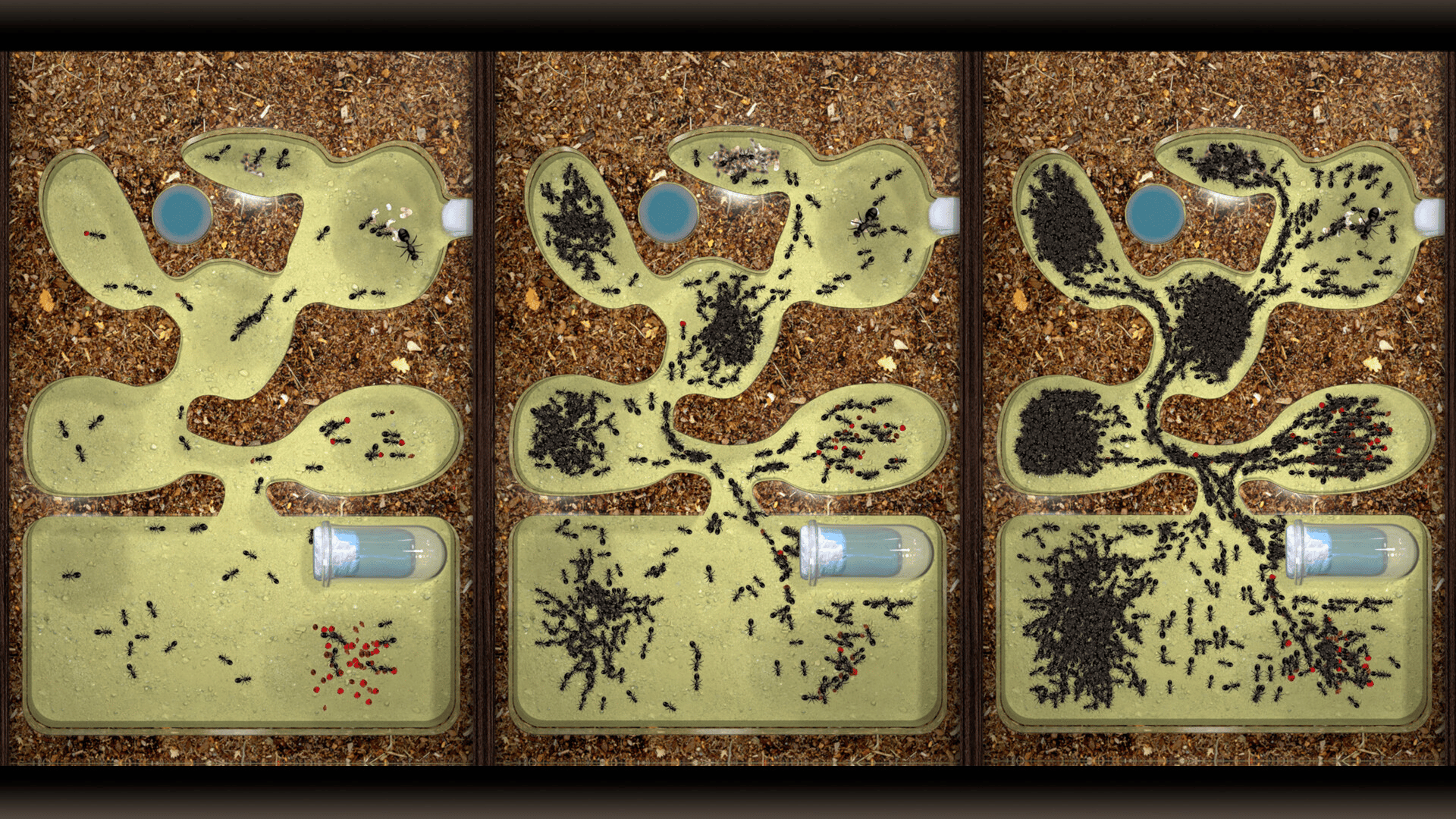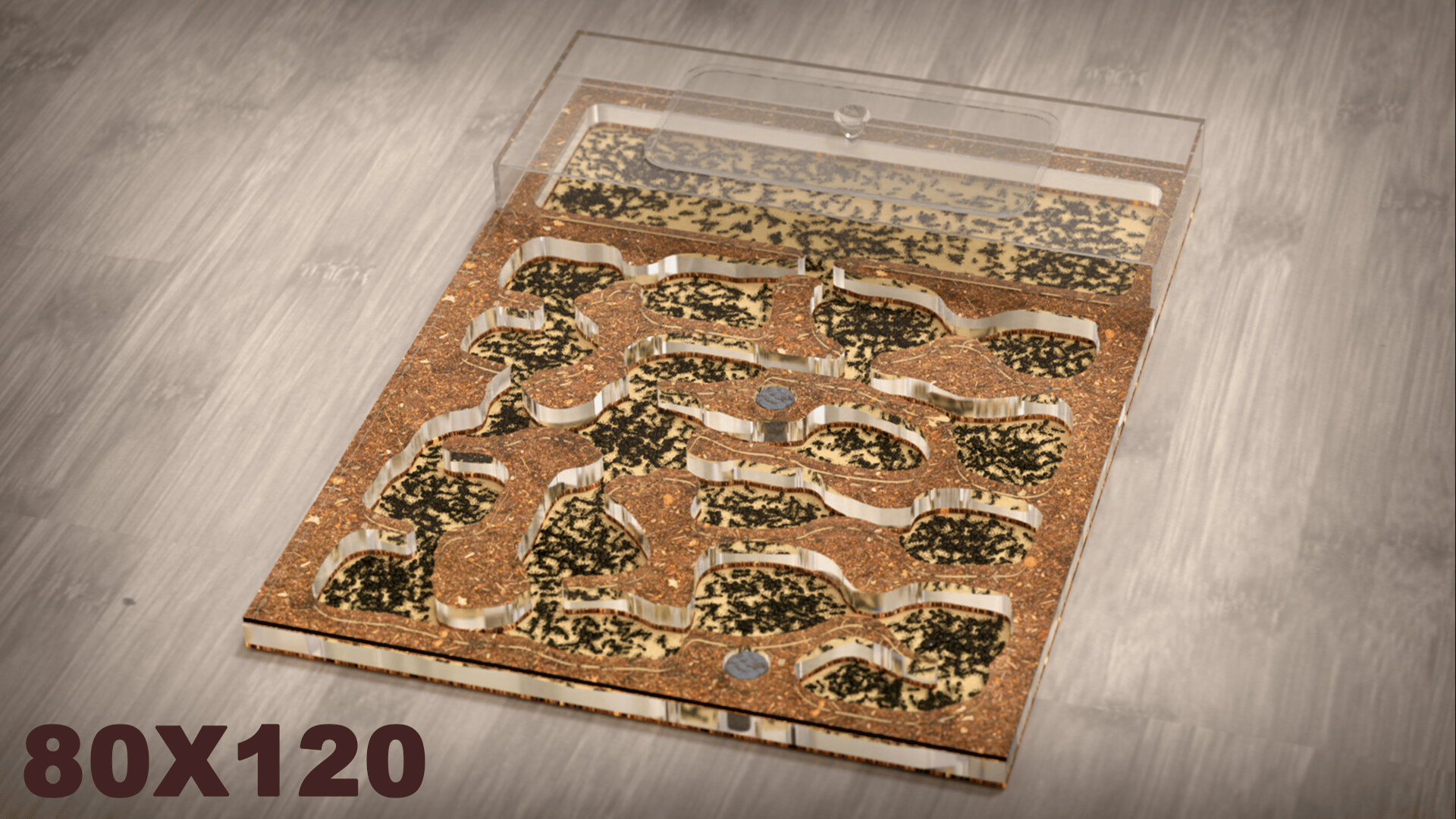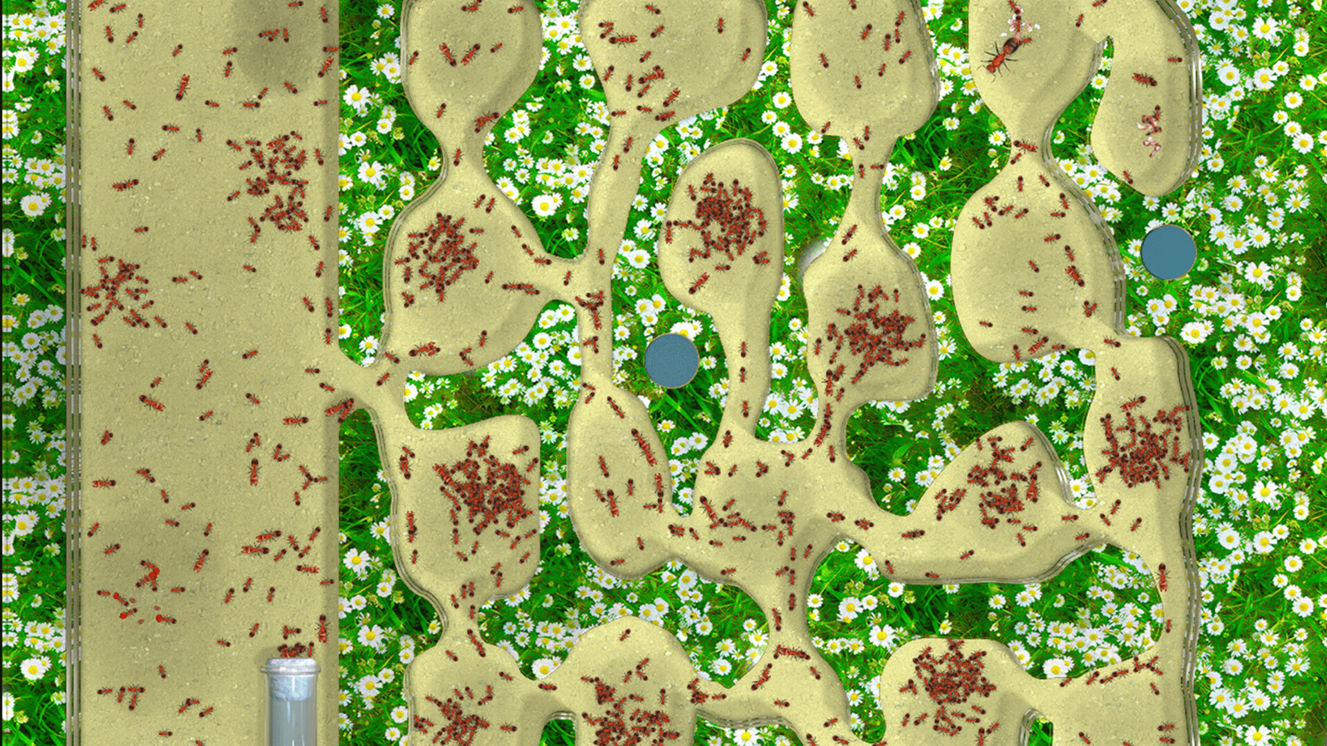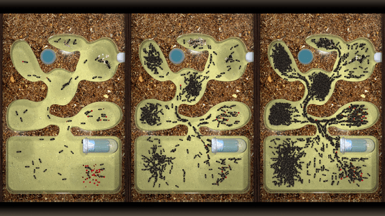 Ant farm (formicarium) with a colony of ants. Ants have artificial intelligence that mimics the full life cycle, behavior, nature and physics of real insects.