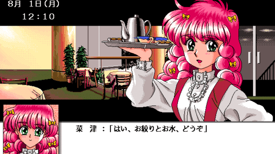 Kyōsuke Takamizawa is a twenty-three year old man who has been having some trouble finding a job. His last teaching experience wasn't particularly successful, and now he is out for better opportunities in the city. However, his real focus is on his charming female acquaintances - from high-school students to waitresses, neighbors, and other women populating the city. Takamizawa Kyōsuke Nekketsu!! Kyōiku Kenshū is a Japanese-style adventure that focuses on getting acquainted with and gradually conquering various female characters. The player is presented with a map of two districts, each with a dozen locations that can be freely visited. The interaction in the locations themselves is sparse, consisting of a few context-related choices. The game has an internal clock; each visit takes away at least twenty minutes of game time. Certain locations are accessible only during specific times. The main challenge lies in being in the right place at the right time in order to meet a specific character. A help screen shows habits and approximate schedules of the many female characters in the game.