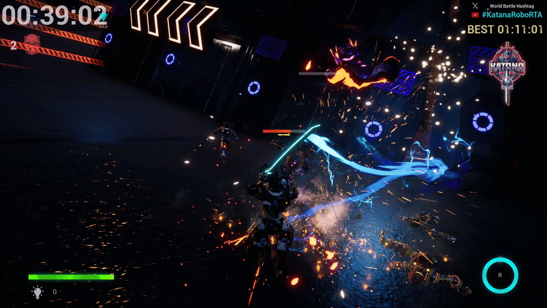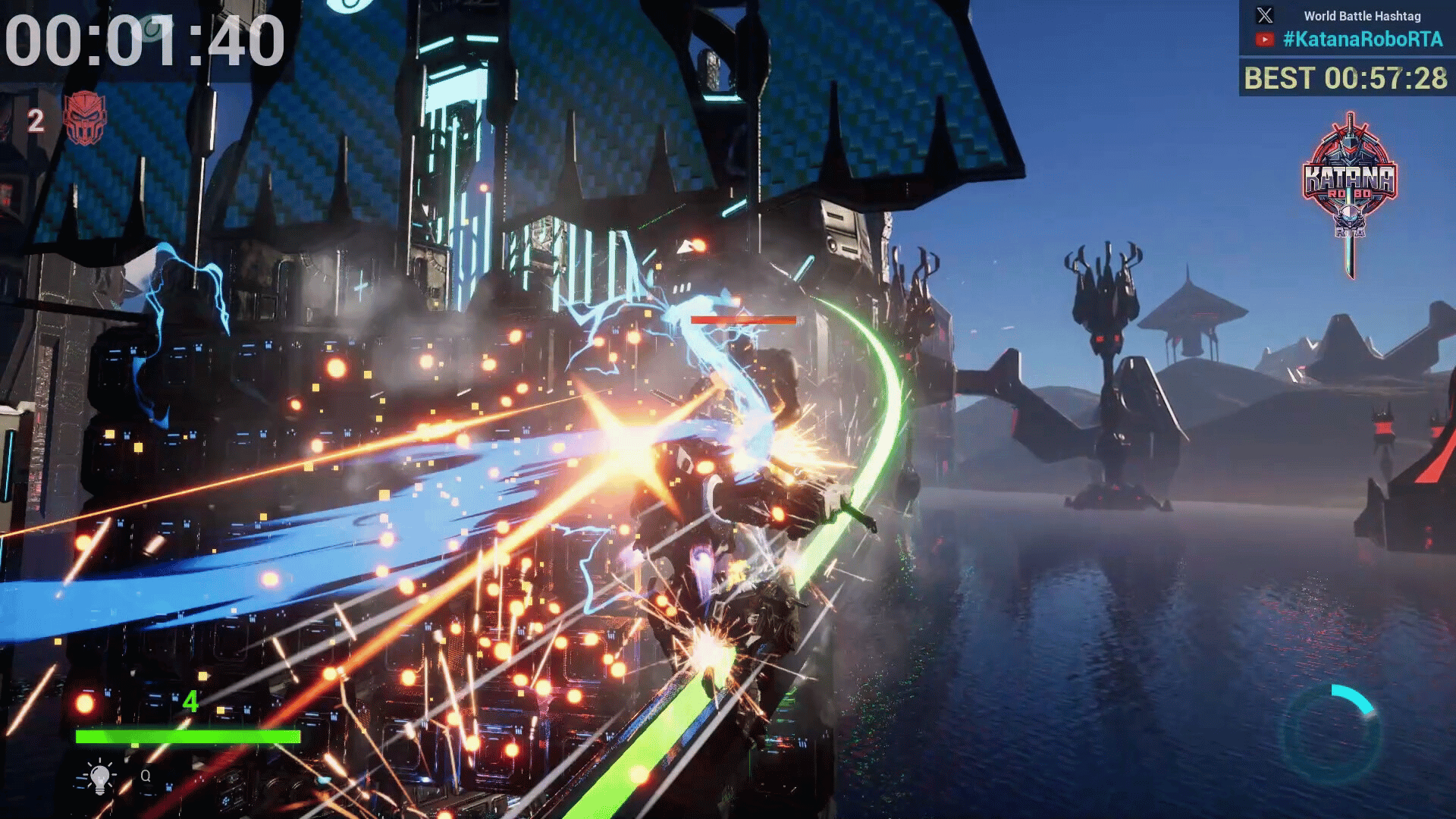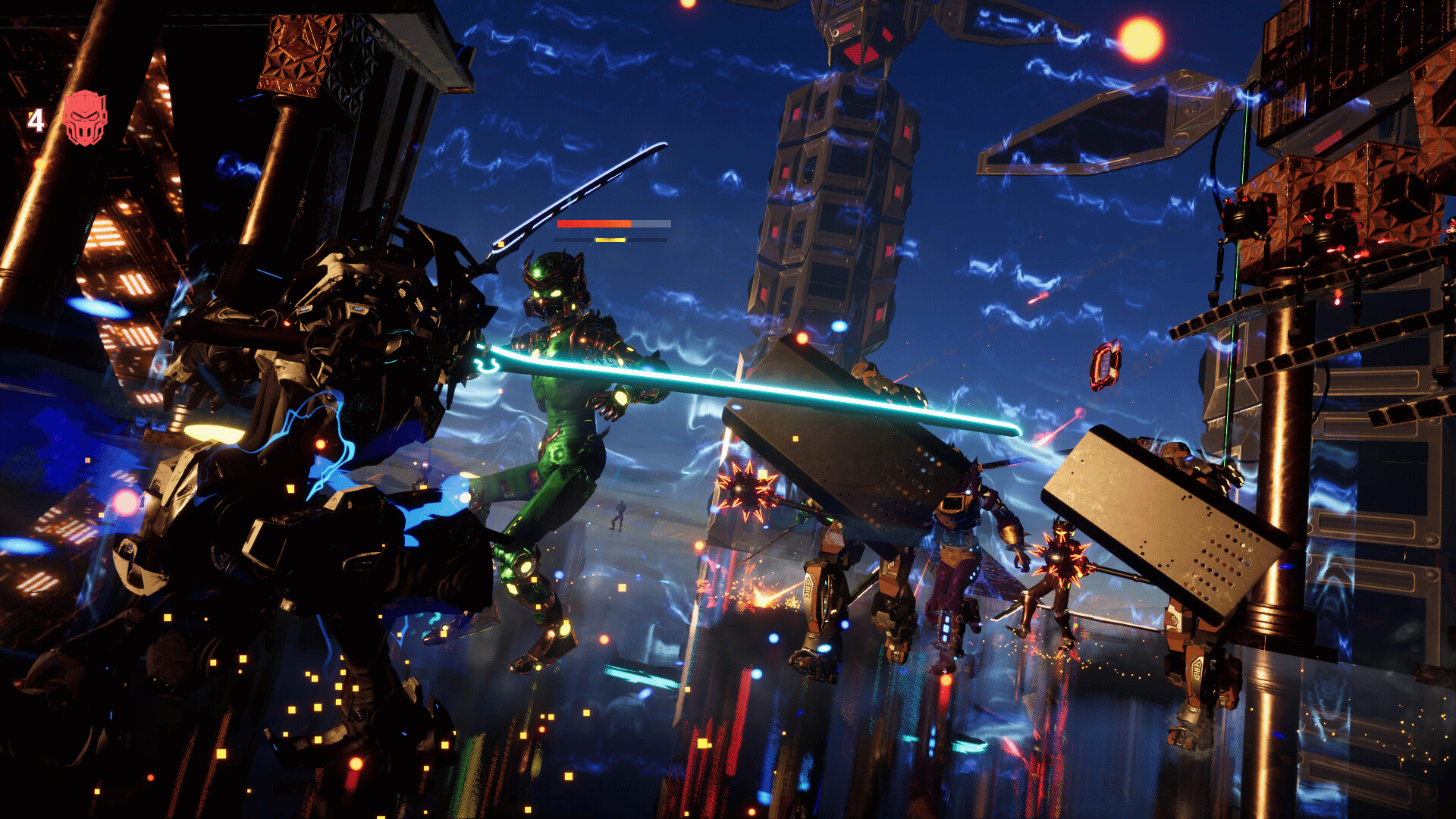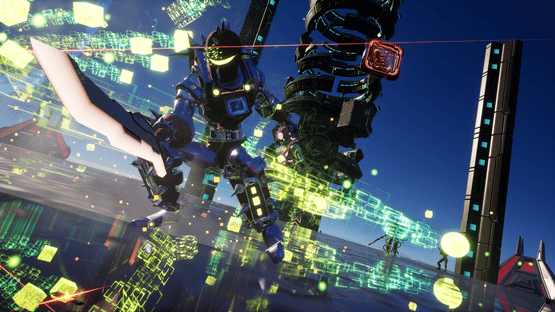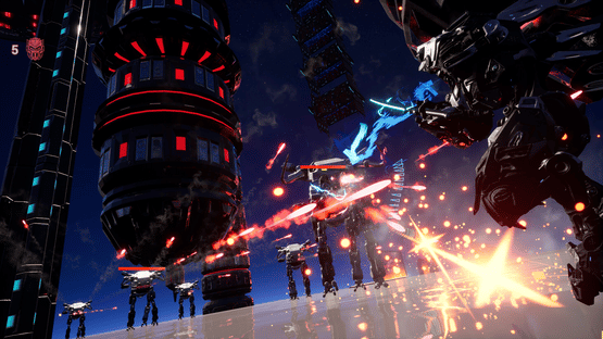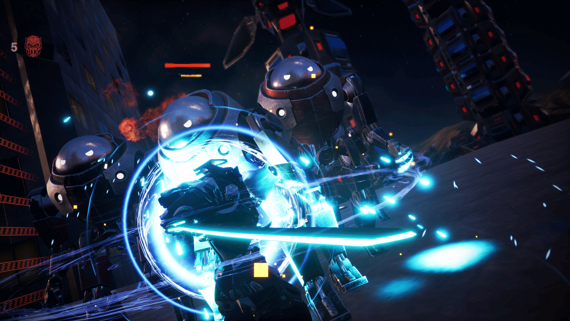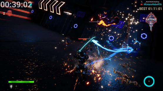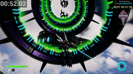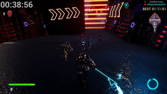 Katana Robo fights his way to the top floor of the Robot Tower, which looks like a platformer game stage, to thwart Samurai Robo's ambitious plan to use the Dominion Sphere at the top of the Robot Tower to control the robots throughout the universe.