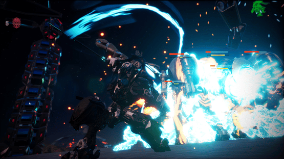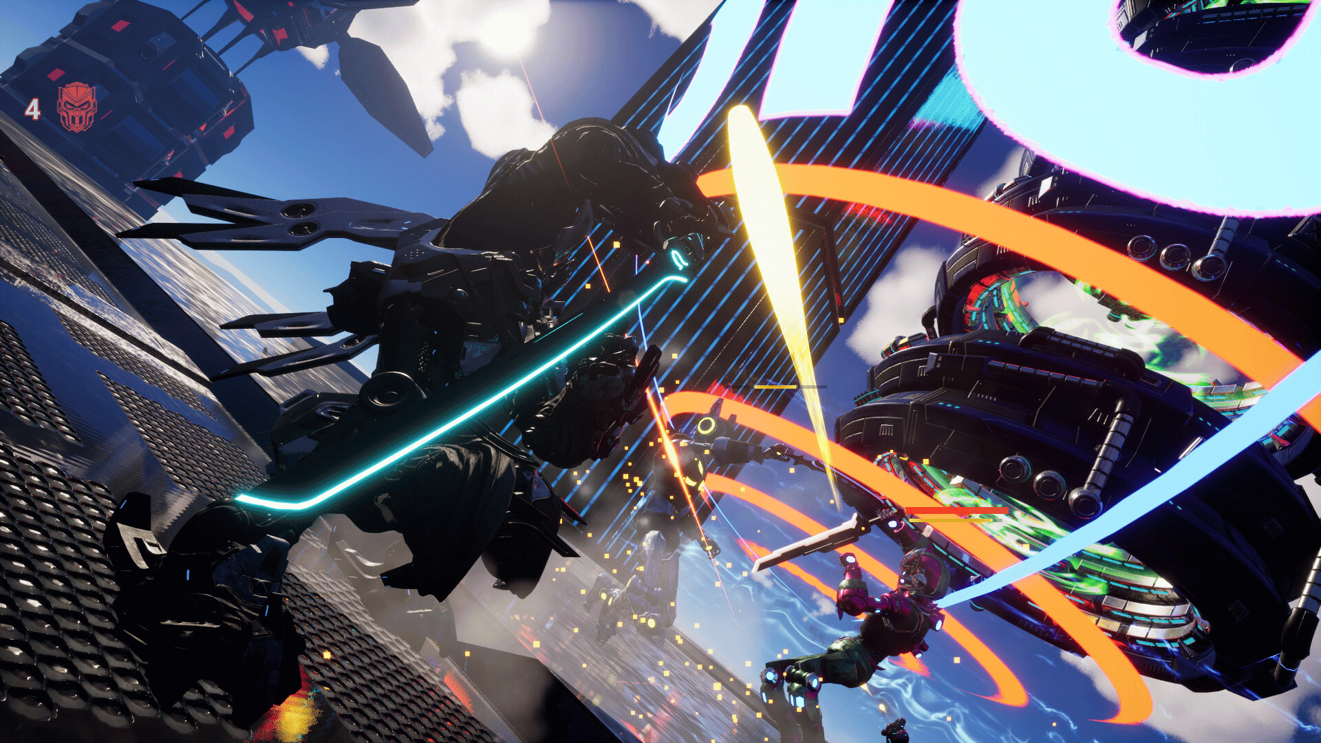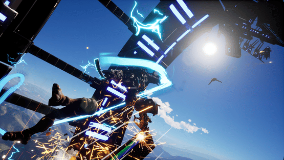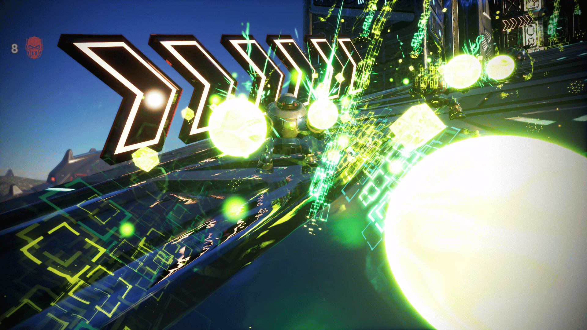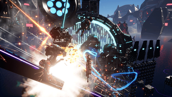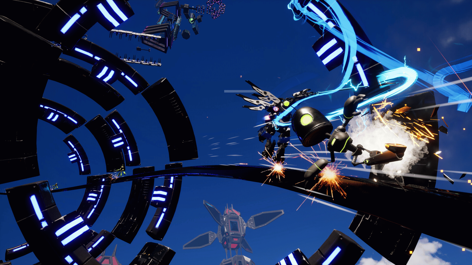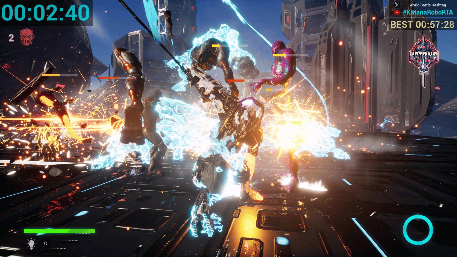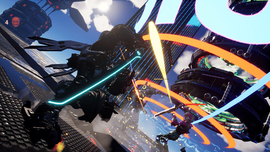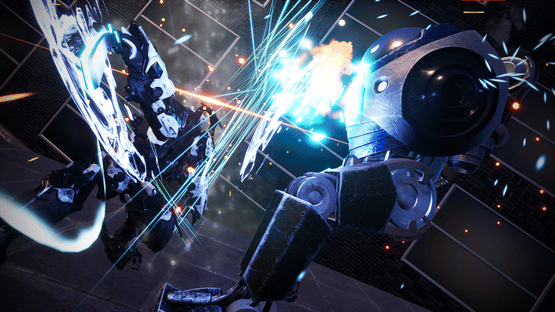 Katana Robo fights his way to the top floor of the Robot Tower, which looks like a platformer game stage, to thwart Samurai Robo's ambitious plan to use the Dominion Sphere at the top of the Robot Tower to control the robots throughout the universe.
