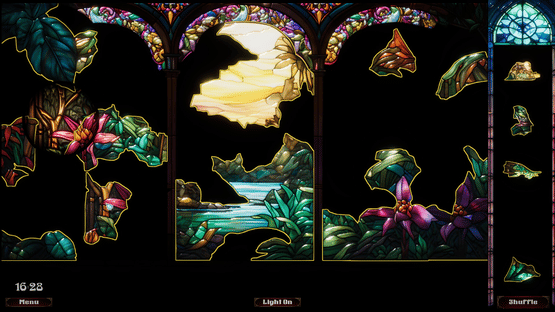 Assemble the broken shards of intricate stained glass mosaics. Use the illuminated watch glass and shuffle through dozens of pieces. Reveal fantastical landscapes, fairytale castles and art-nouveau murals.