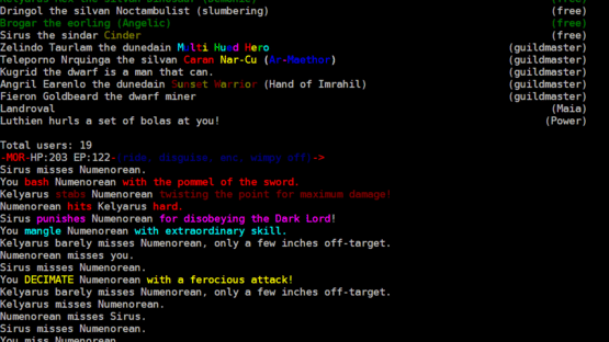 The Two Towers MUD is a free Multiplayer Online Roleplaying Game set entirely within Tolkien's world of Middle-earth, at the time of 'Lord of the Rings'. We have extensively re-created the lands of Middle-earth in a rich text environment, from Mithlond to Mordor and the lands of Harad beyond. With over 100,000 rooms and always growing, The Two Towers is a richly developed and highly interactive world. There are hundreds of quests, with rewards great and small, for you to discover. The Two Towers has an active community of players from around the world who come together to play online. Players join together to create guilds, raid enemy lands, and more. Online continuously since 1994, The Two Towers is one of the longest running multiplayer games on the internet and is maintained by a staff of hardworking volunteers who love Tolkien and multiplayer gaming.