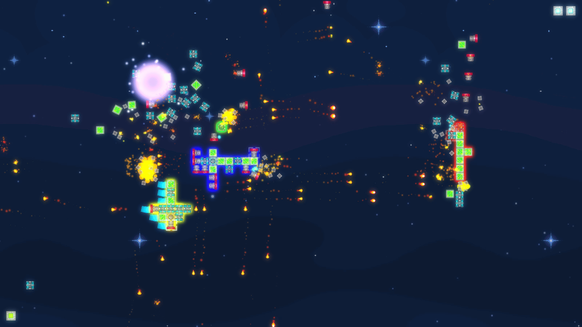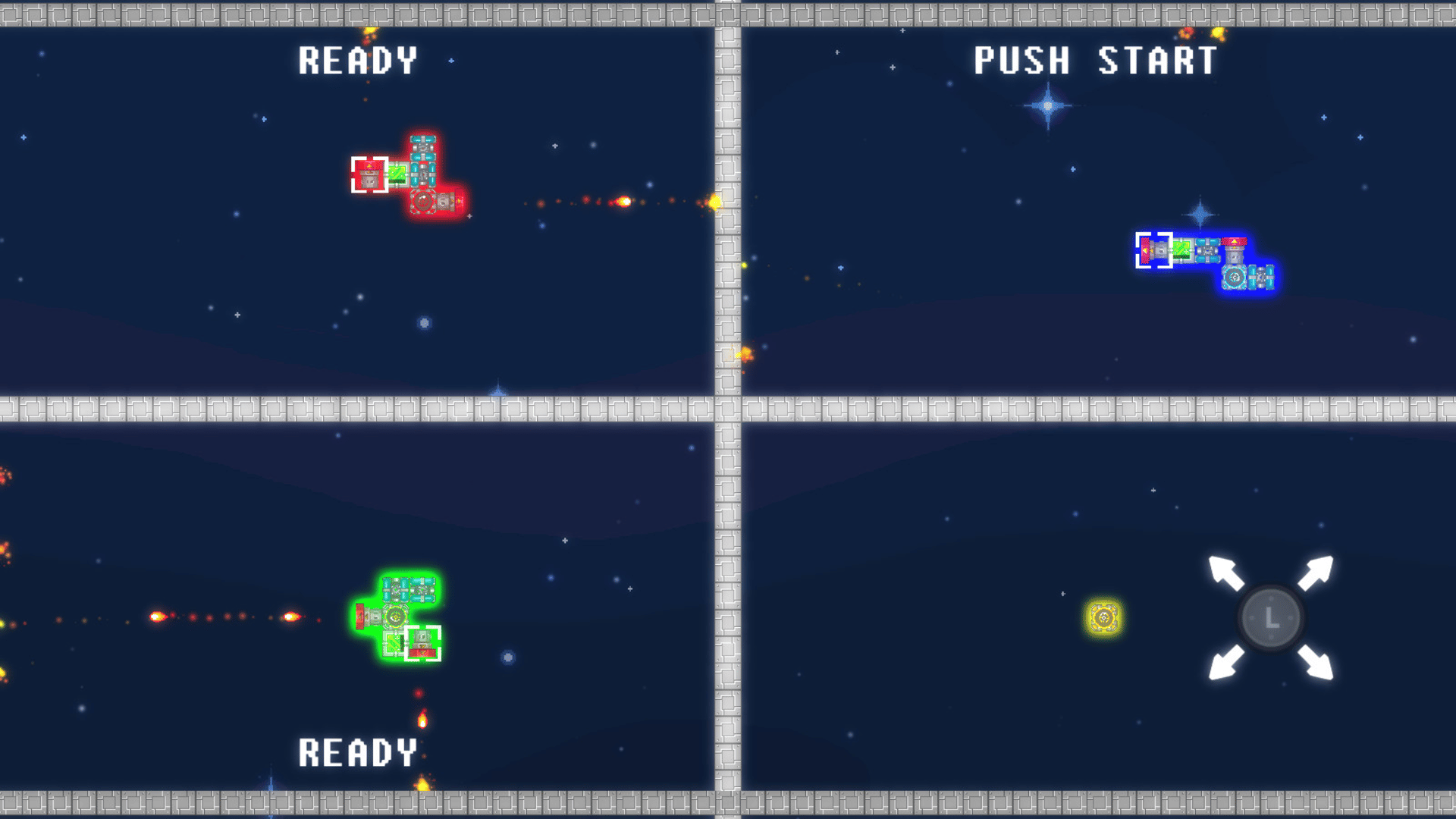 BLOCKSHIPS The illegitimate offspring of Space Invaders and Tetris A game about building a bigger, better ship whilst blasting your buddies' to bits (and shouting about it). It is a local multiplayer party/arena game and challenges you to strike the right balance between speed, power, manoeuvrability, and of course fun :)