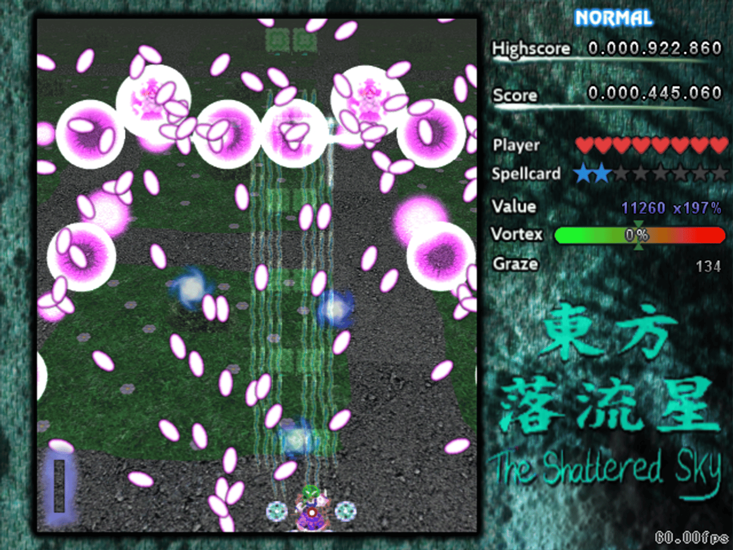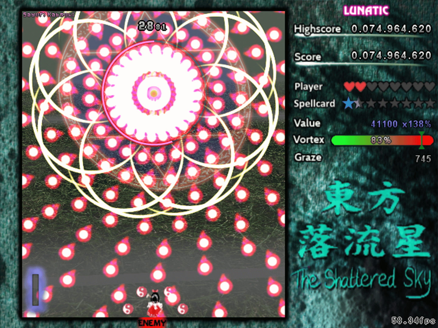 Touhou Rakuryuusei ~ The Shattered Sky is a fan-made Touhou Project game made using the Touhou Danmakufu ph3 shooting game engine, programmed by Eredom of Dream Compass with music by Abner and character art by Moonturret. The game was released on 23 June 2017, and features 6 stages and 3 Extra stages. The game features 3 playable characters.
