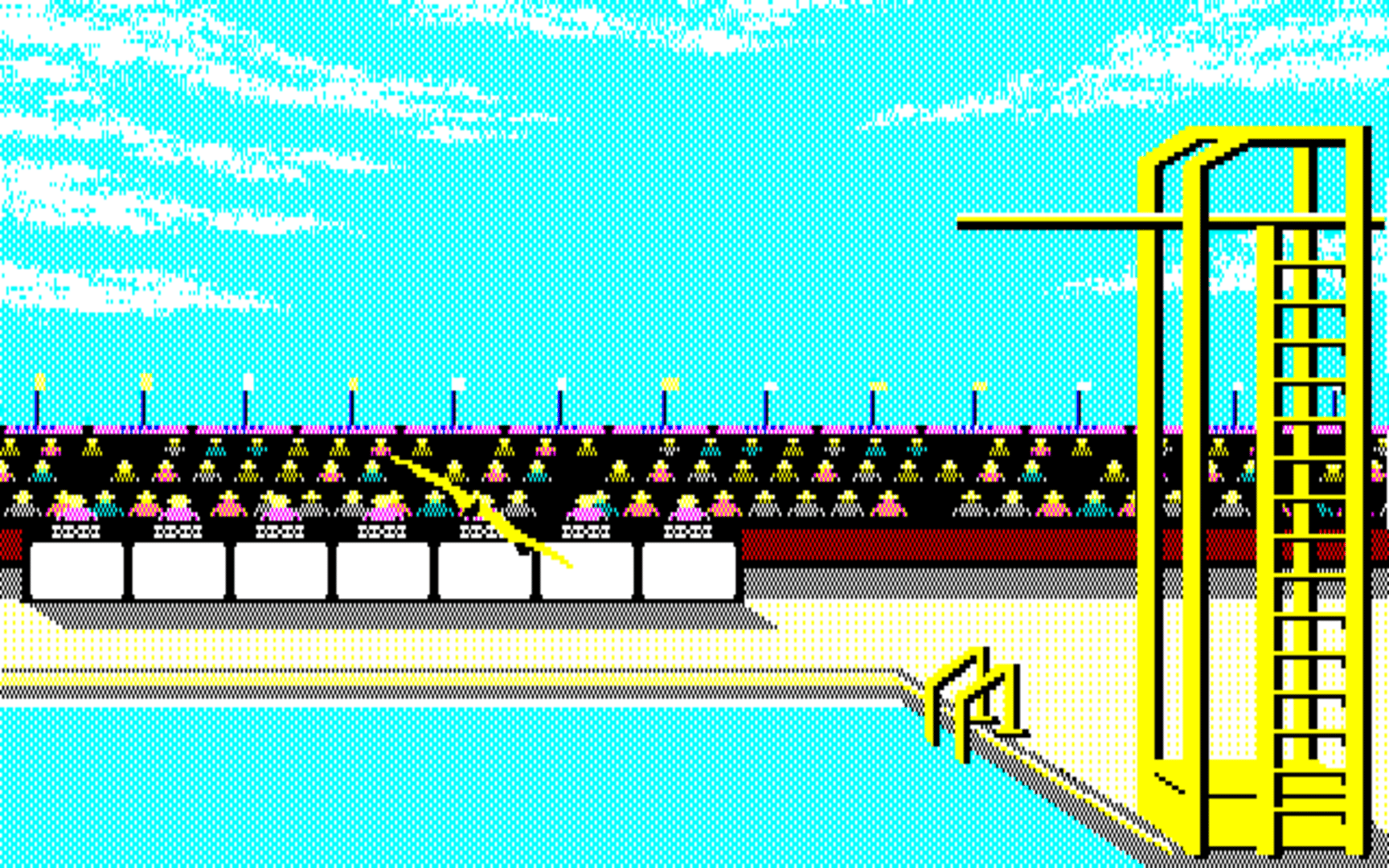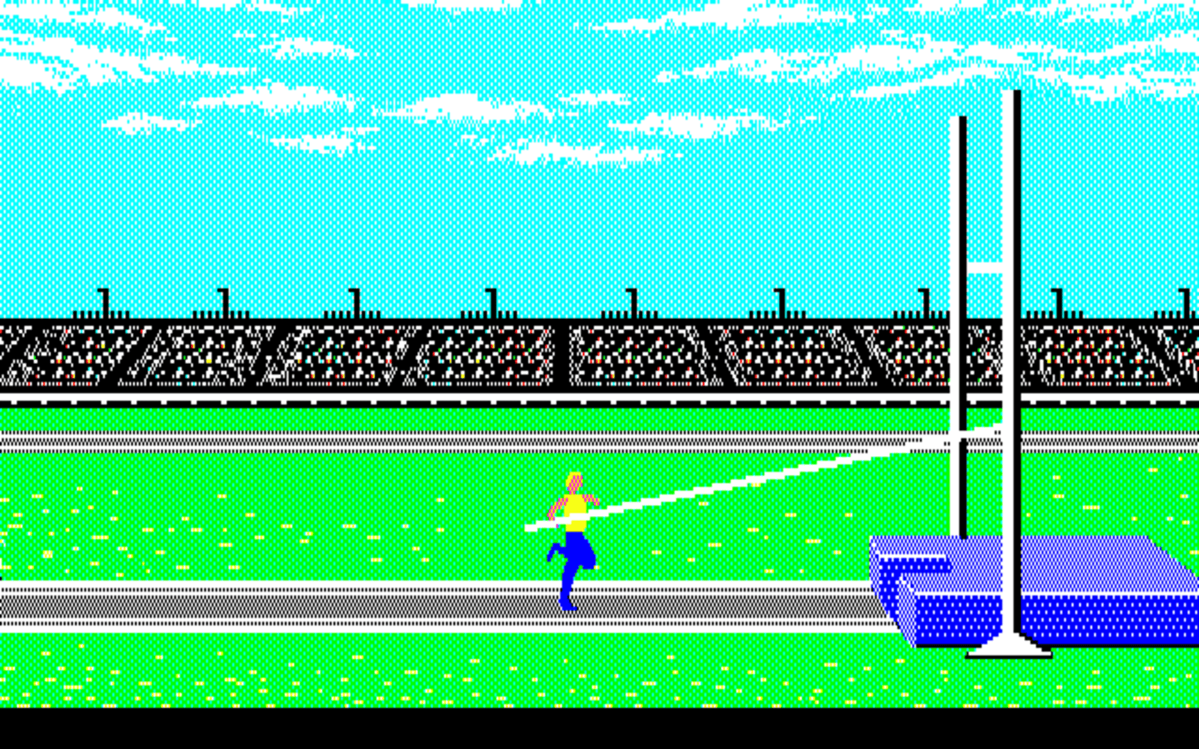 The PC-88 port of "Summer Games". Summer Games allows up to eight players to compete in a series of summer themed Olympic events. The gameplay is similar to the other entries in Epyx "games" series. Each player can choose a country to represent, and then takes turns competing in various events to see who will win the gold medal! The game allows you to compete in all of the events sequentially, choose a few events, choose just one event, or practice an event. The events available vary slightly depending on the platform, and may include: - Pole vault - Platform diving - 4x400 meter relay - 100 meter dash - Gymnastics - Freestyle swimming - Skeet shooting - 100 meter freestyle - Rowing