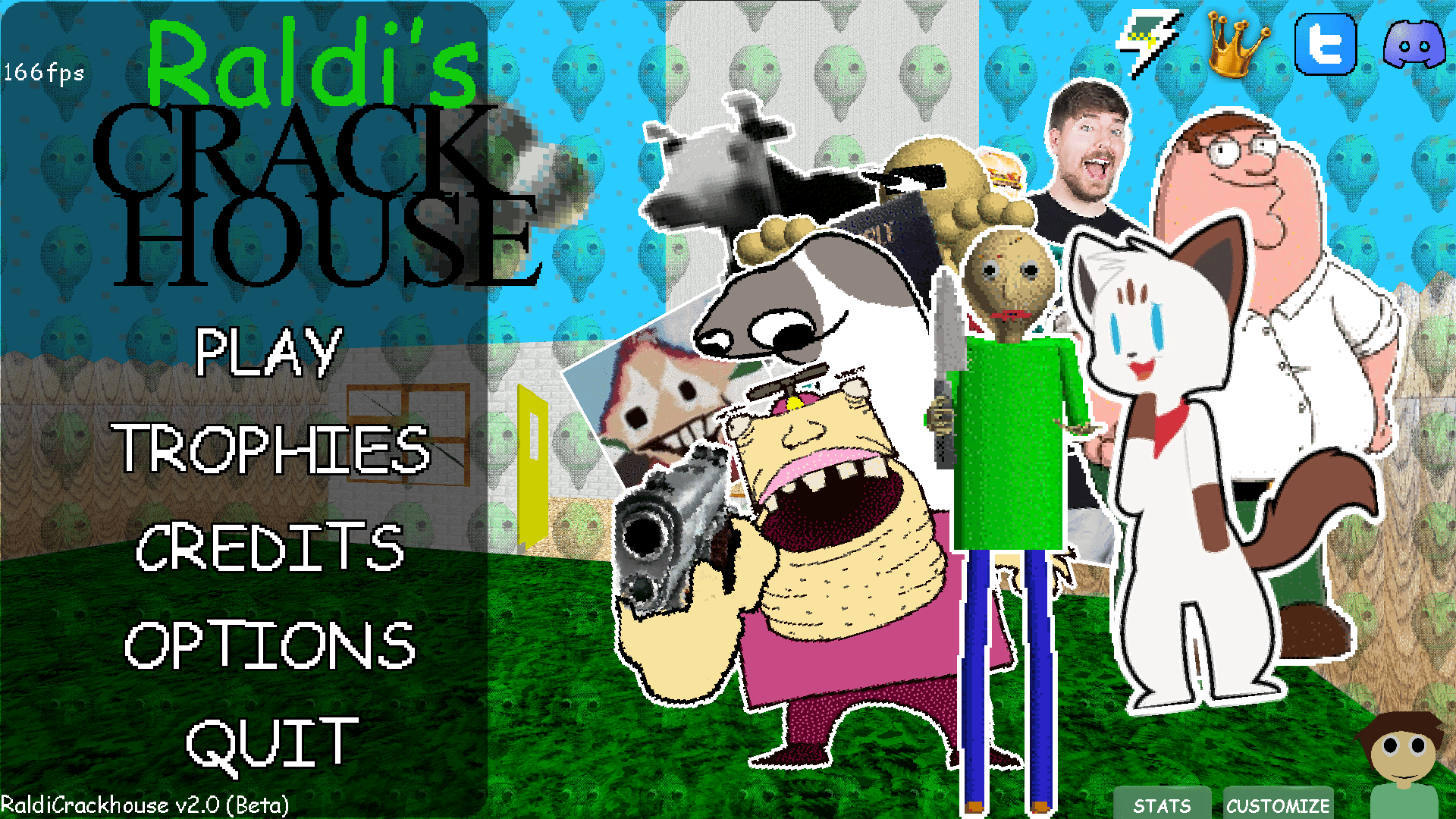 One of the Baldi's Basics mods ever made. Can you escape Raldi's Crackhouse? Run around the school, and collect 10 notebooks before Raldi can catch you.. Discover fan favorites such as Chipfloke, Pinto Beans, Van Man, MrBeast, and of course, Raldi himself! Can you outsmart Raldi and the other characters and uncover all of the hidden secrets of the crackhouse?