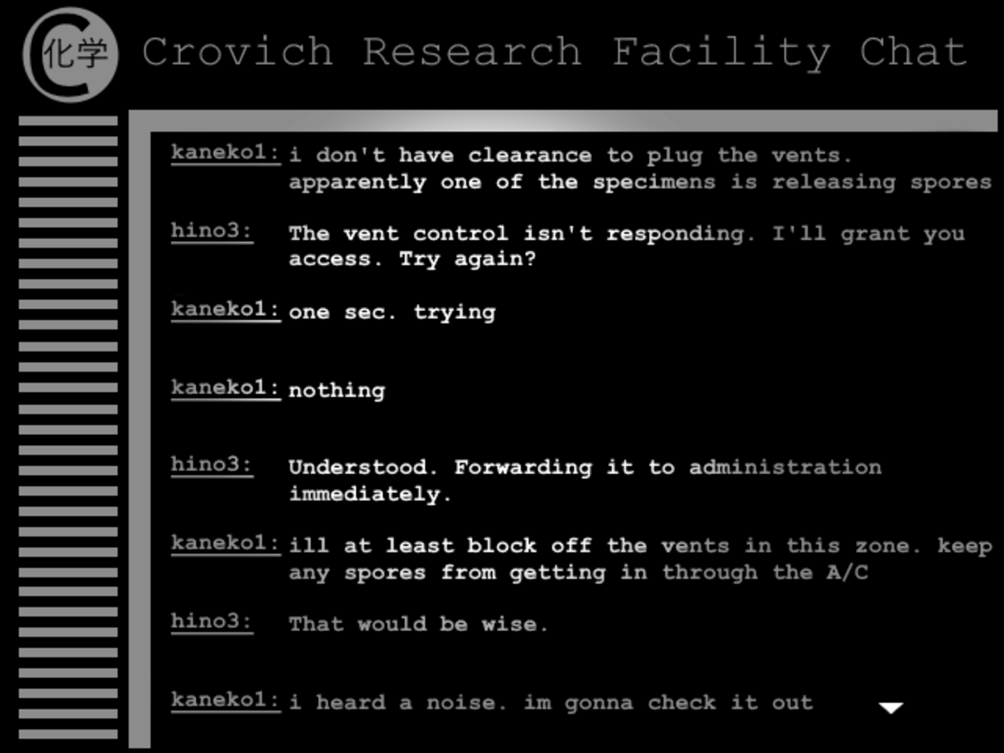Oni No Kenkyuushitsu ("Laboratory Of The Oni") is a sequel to Oni No Yakata, set 10 years in the future, in the year 2028. You once more play as Ayana Hasegawa as she enters a new job as an intern at Crovich Research Facility, hoping to find a solution to the existence of the Oni that cost her the life of one of her friends, and the lives of many others before them. Little does she know, a combination of poor containment procedures and upper management with ulterior motives will cause the facility to unexpectedly release its specimens and cause chaos.