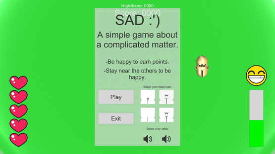 A simple game about a complicated matter. Be happy to earn points. Stay with other people to be happy.