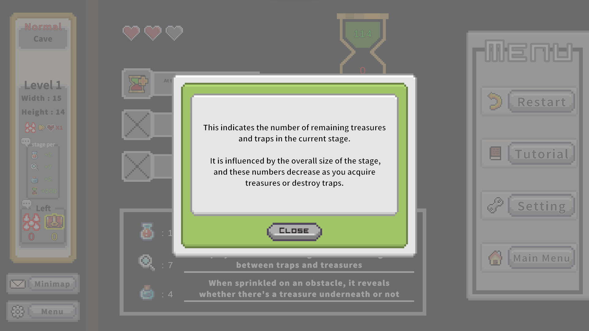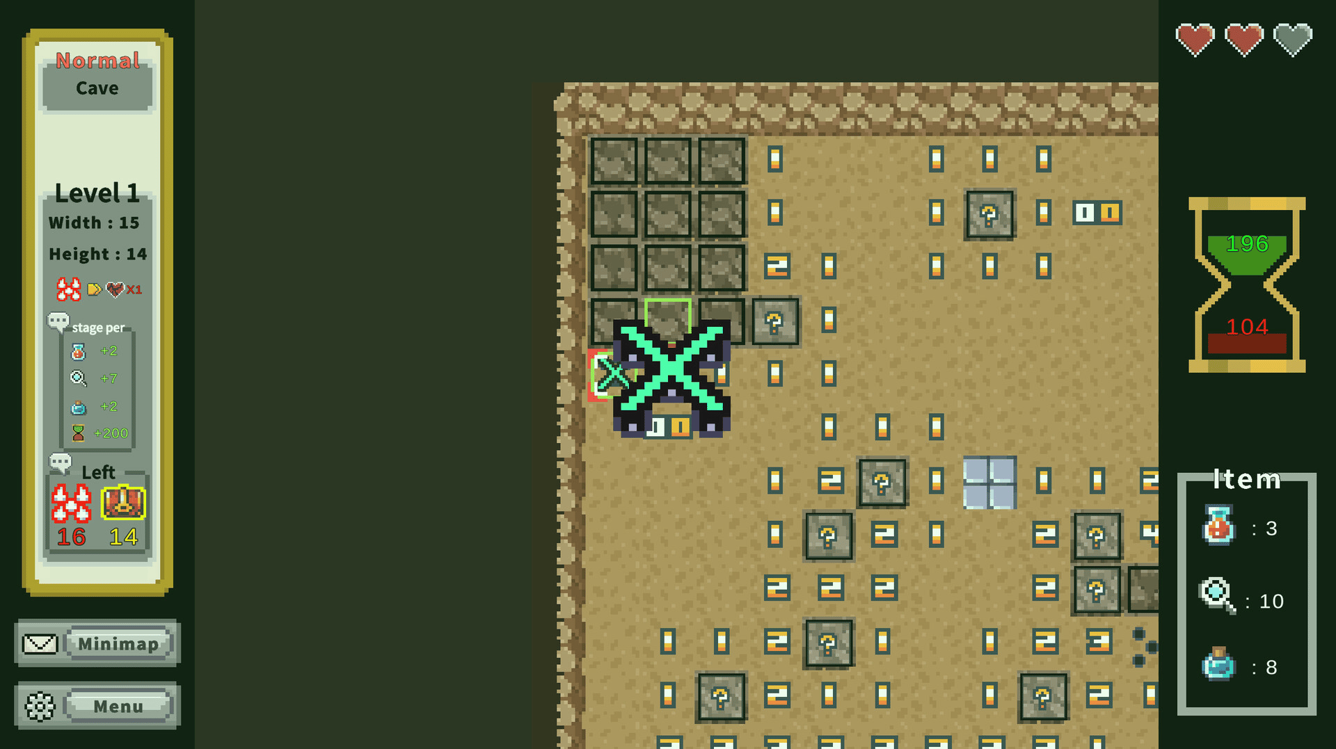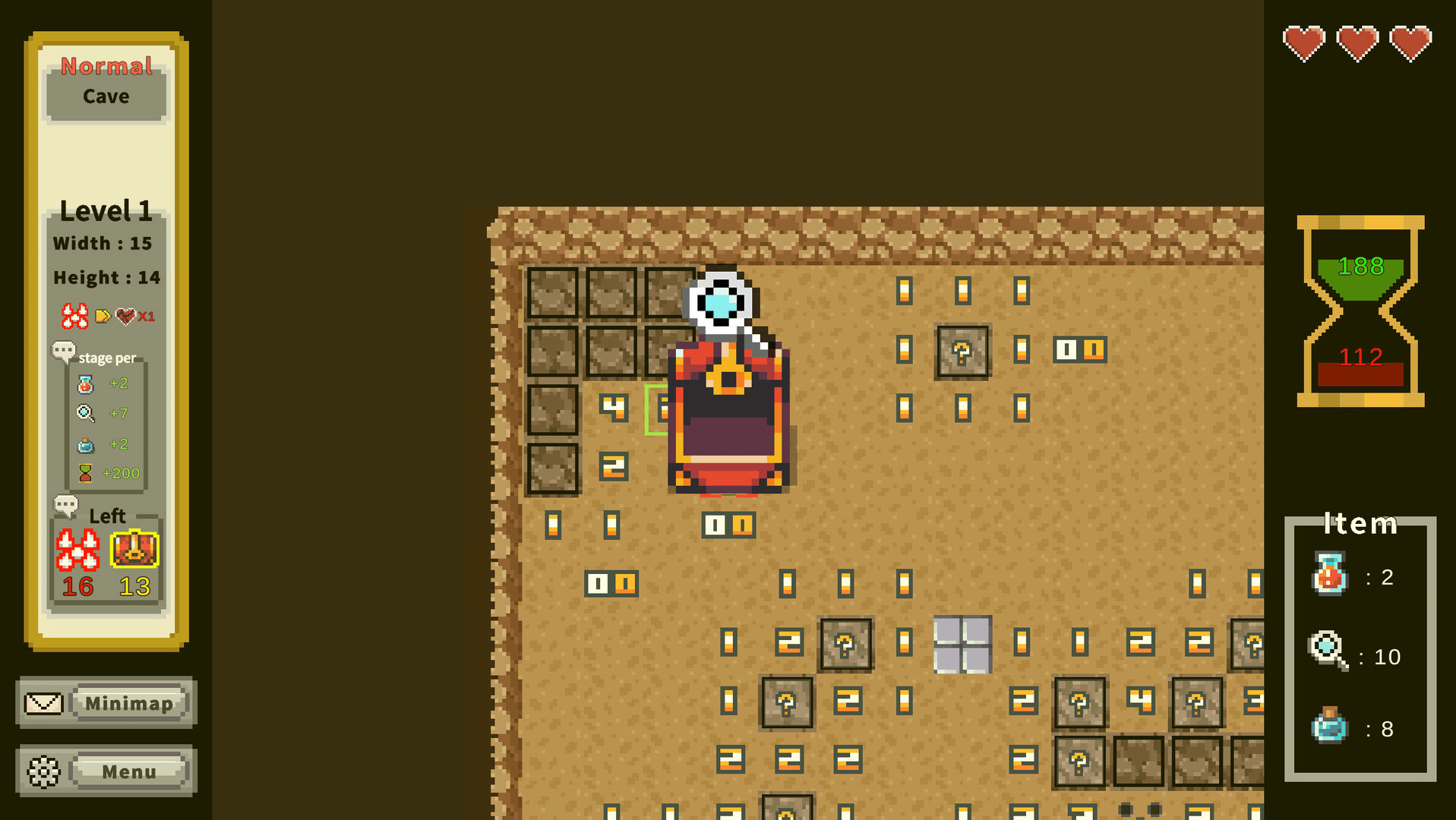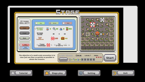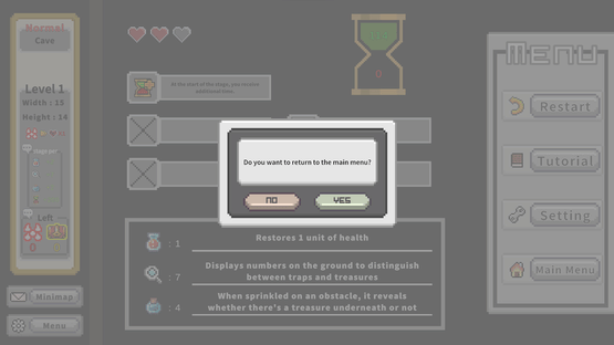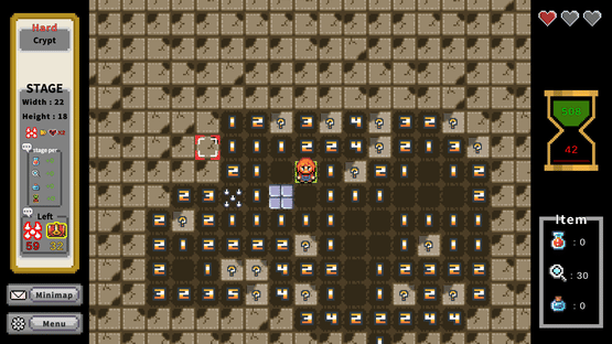 In this twist on minesweeper, find all treasures while avoiding mines to clear stages. Use items, deduce from nearby counts, or guess to identify tiles. Features a large-scale mode with multiple stages leading to a final treasure, and a small-scale mode focused on deducing a single stage.