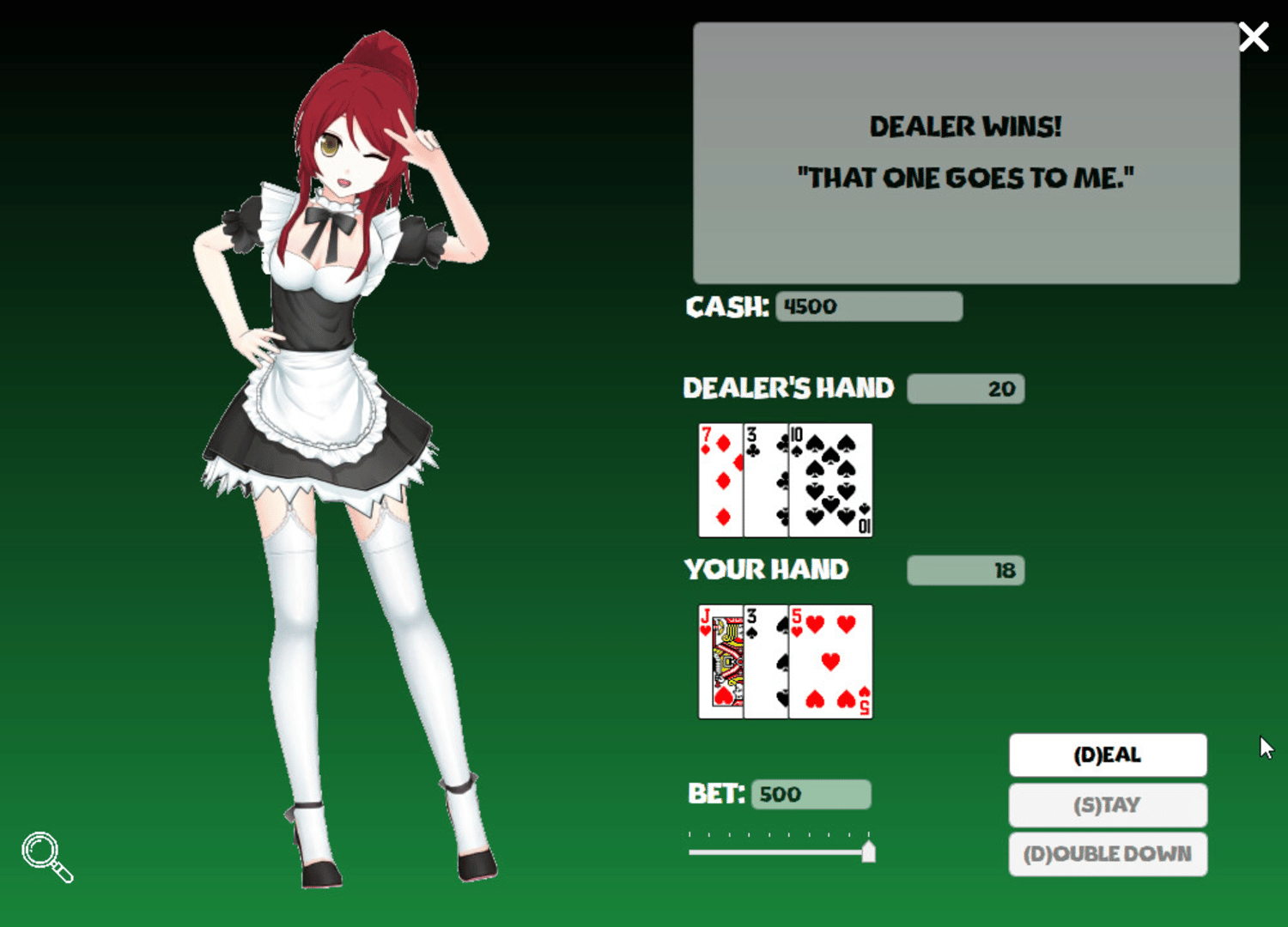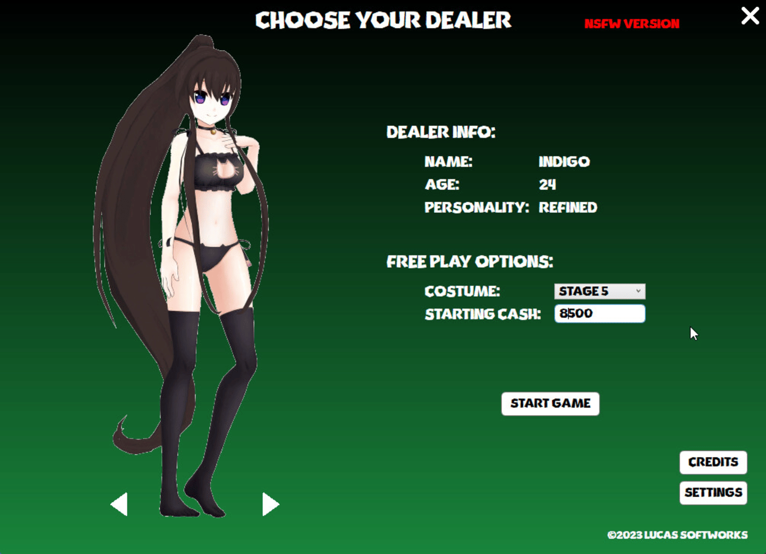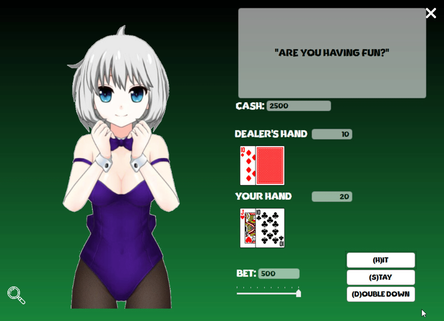 Come in, sit down and play a few hands of Blackjack. Relax in a casino atmosphere with one of our three sexy dealers, each one featuring a unique personality and plenty of costumes to unlock.