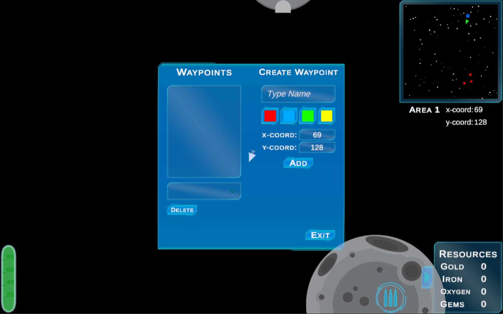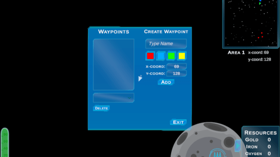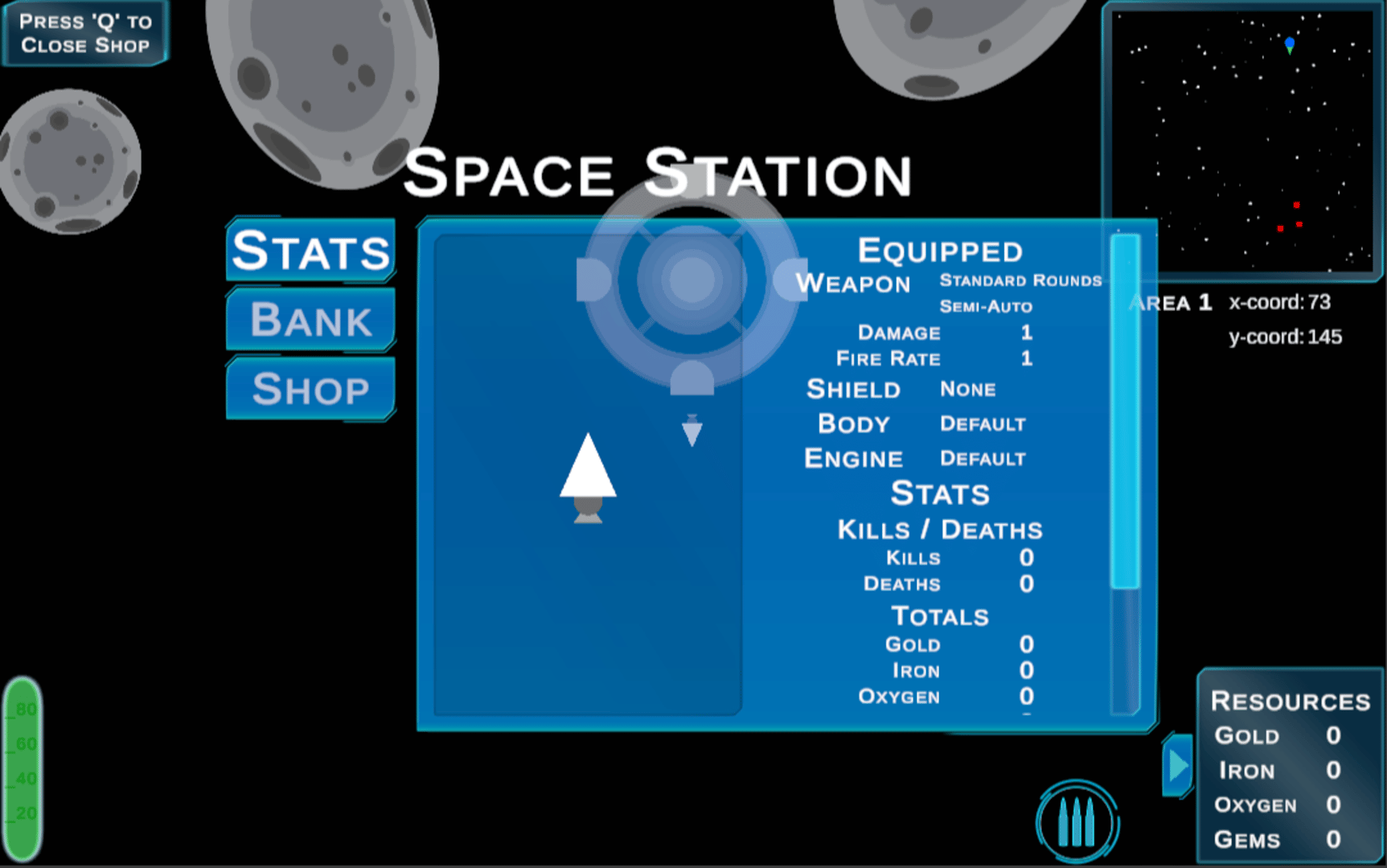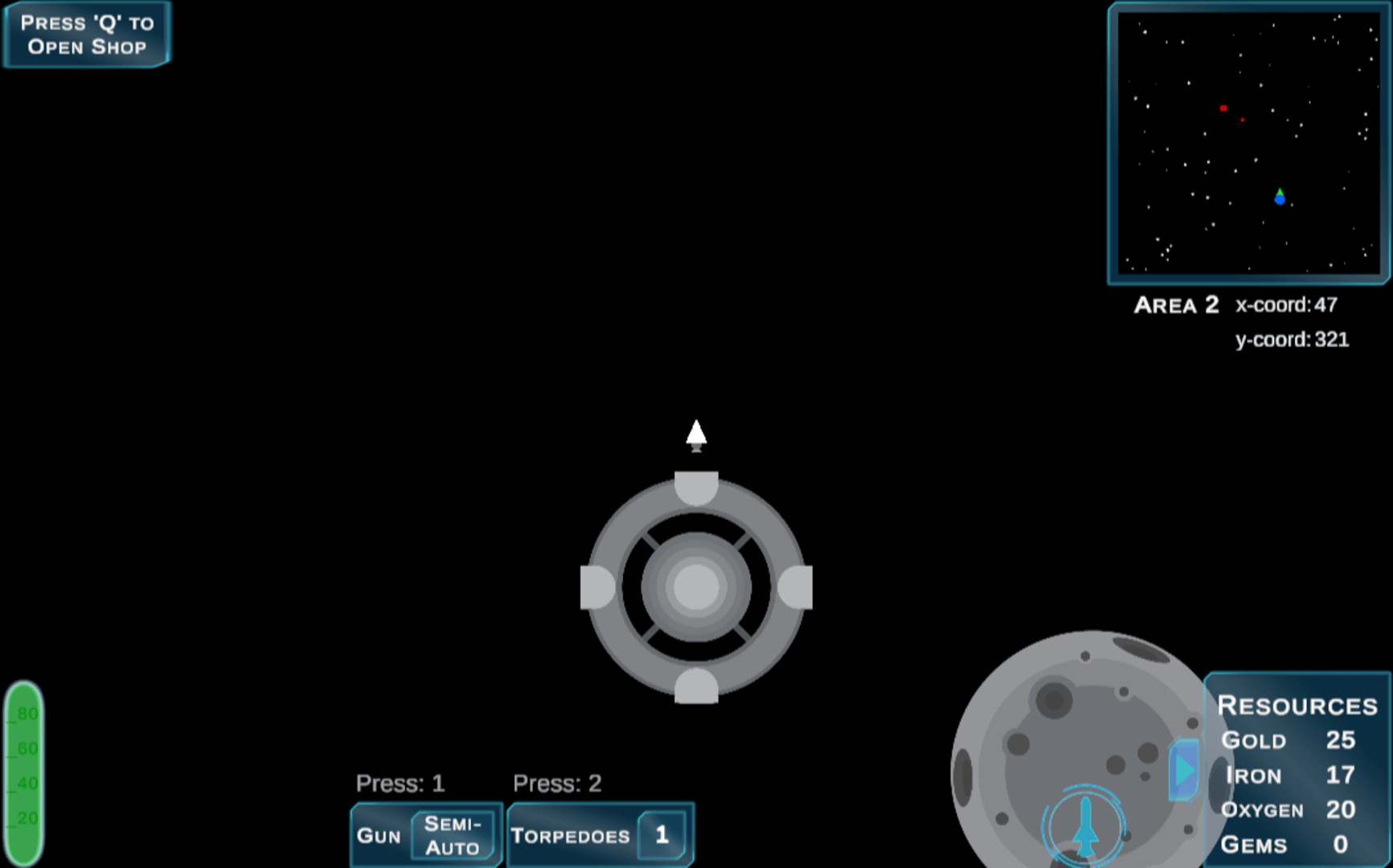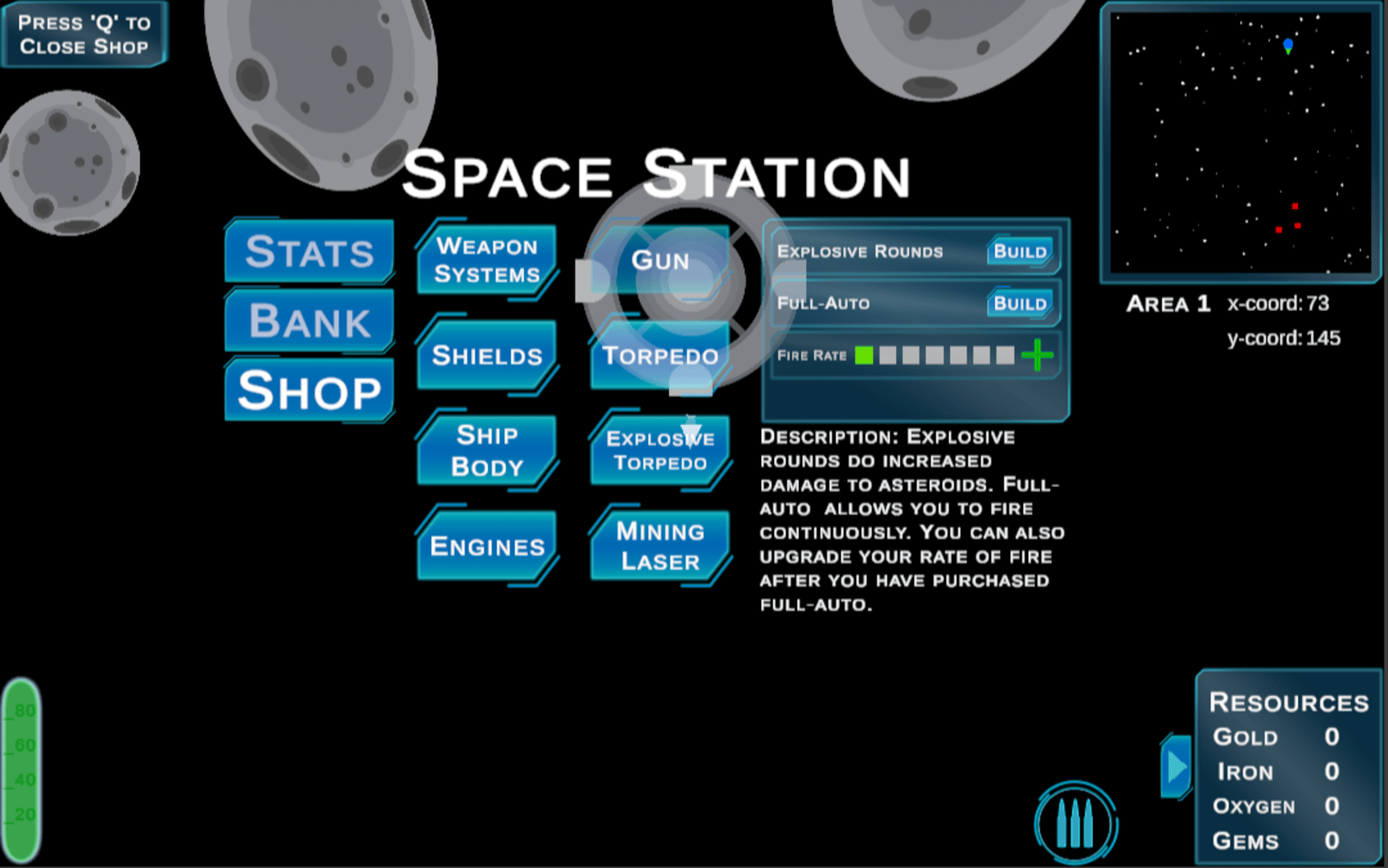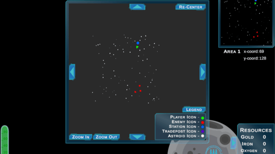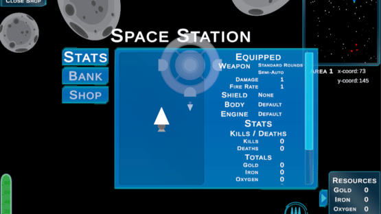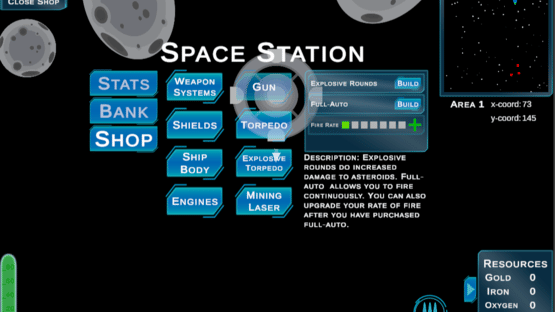 Travel through space as you mine for resources like gold, iron, oxygen, and gems. Use collected resources at space stations to upgrade guns and shields and improve gas usage. Mostly a peaceful game of exploration, you will have to monitor your ship's gas and ammo usage and may occasionally attract the attention of pirates who will attempt to destroy your ship. In Out of Gas, the environment beyond the starting area is procedurally generated and completely random. Apart from the special colored asteroids, the dropped resources are also completely random. There is a chance that you will encounter a trade post, where you can trade gems for large amounts of other resources such as gold, iron, and oxygen.