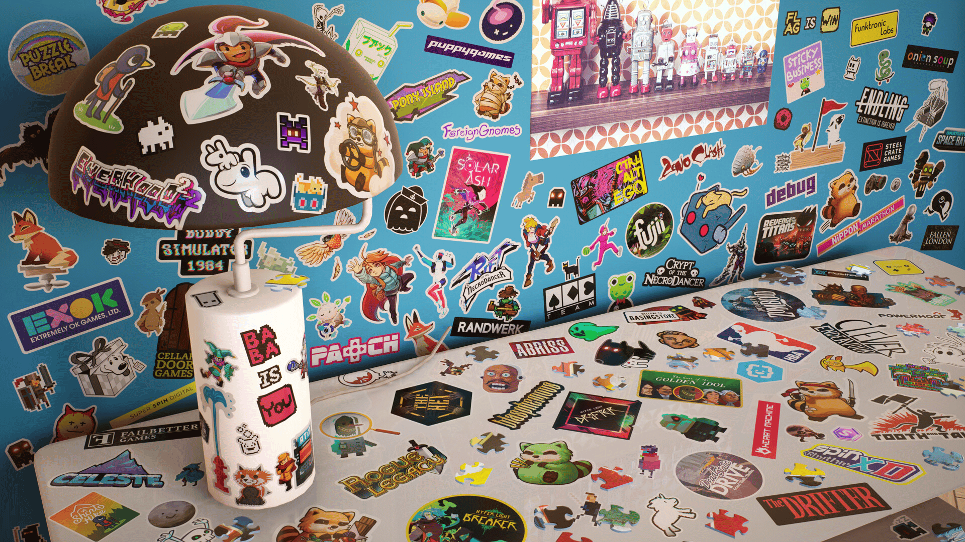 Hundreds of stickers to collect to place in your room or your friends room in Multiplayer! Stickers from your favorite indie games! Fully customizable cursor trails in many styles. Bats, Butterflies, snowflakes and more!