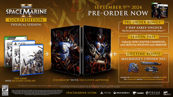 Pre-order the Warhammer 40,000: Space Marine 2 Gold Edition to receive the Macragge&rsquos Chosen DLC and play up to 3 days before release.About the early unlock:The early unlock is not guaranteed for Canada territory.Please make sure to check the shipping time when you place your order to ensure delivery before the release.Day one delivery is not guaranteed with standard shipping option.The Warhammer 40,000: Space Marine 2 Gold Edition includes the base game Warhammer 40,000: Space Marine 2, the Season Pass and an exclusive Steelbook.Embody the superhuman skill and brutality of a Space Marine. Unleash deadly abilities and devastating weaponry to obliterate the relentless Tyranid swarms. Defend the Imperium in spectacular third-person action in solo or co-op modes.