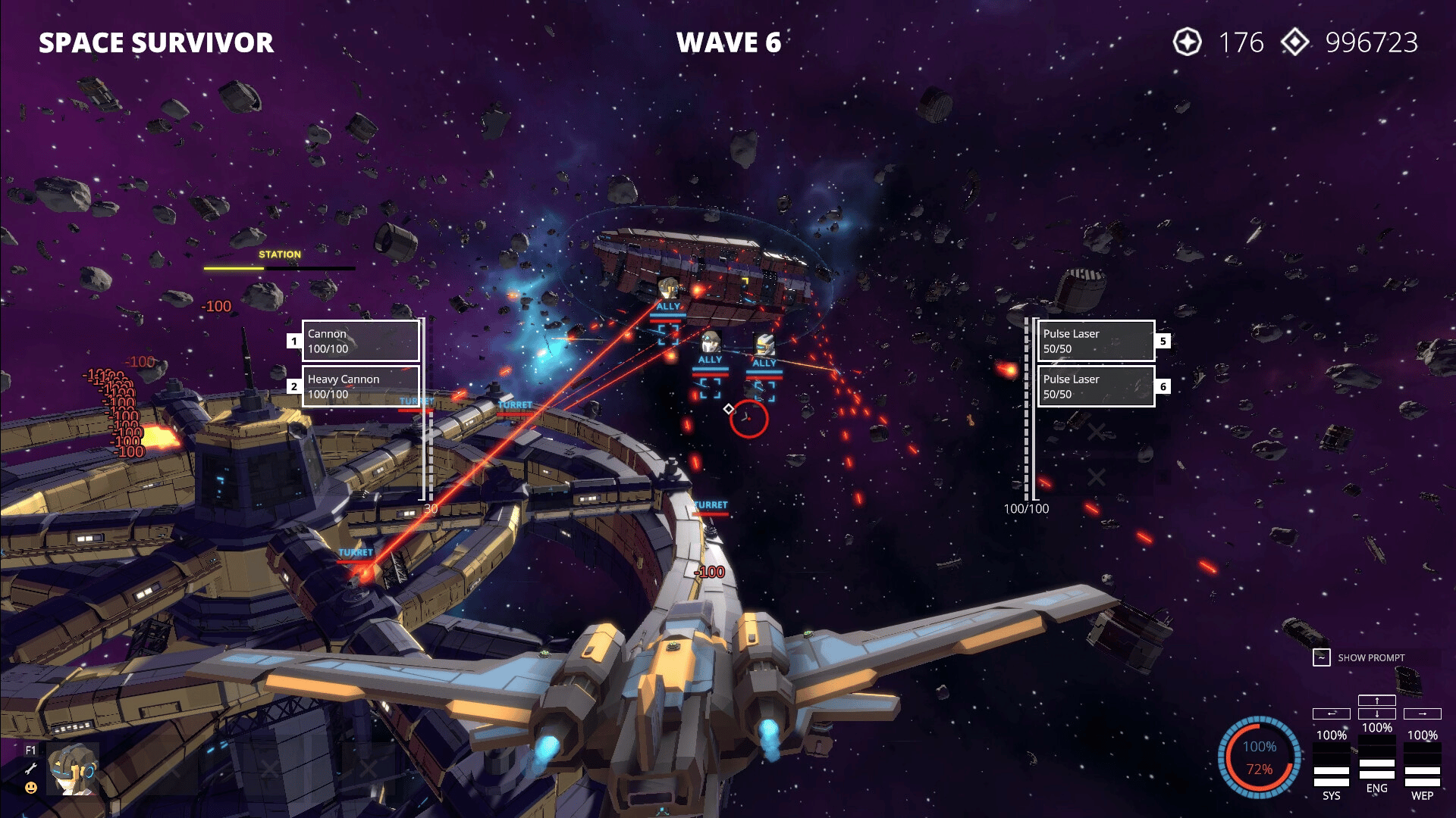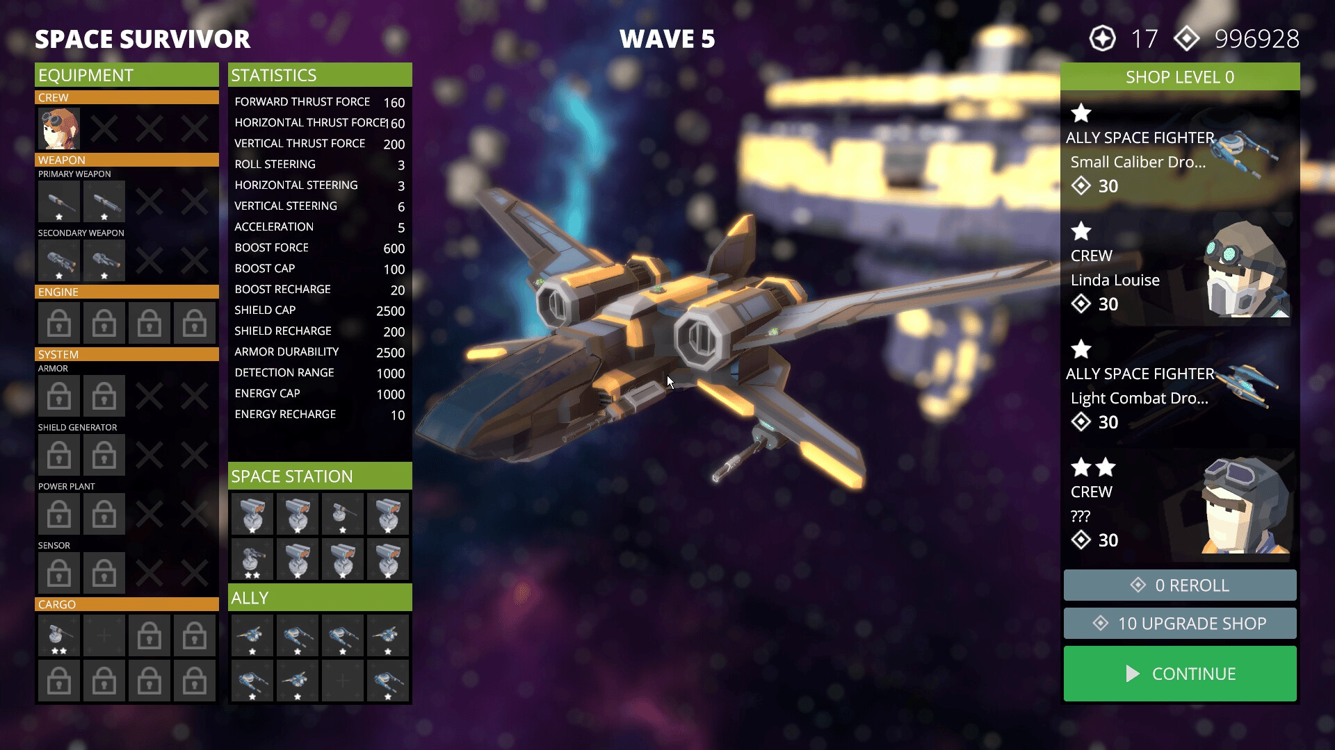 Space Survivor is a space-themed rogue-like game. Piloting and upgrading spaceships, recruiting crew members, recruit wingmen, constructing space station defense systems, and defending the space station.