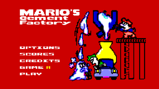 This is a Commodore 64 port of a Game and Watch classic. The player controls Mario working in a cement factory, where one has to make sure the cement carried from the top of the screen reaches one of the two concrete mixers on the lower corners of the screen safely. The cement can't go directly into the mixers though. It must first go through four tanks which Mario can open by activating levers. His task is to go back and forth between all four spots and release the concrete before anything is spilled. Failure to do so will result in dumping of said concrete on the truckers waiting to make their delivery. To reach the different levers Mario must travel between floors via elevators, which must be taken carefully to avoid Mario falling off. Game B is a harder version of the game.