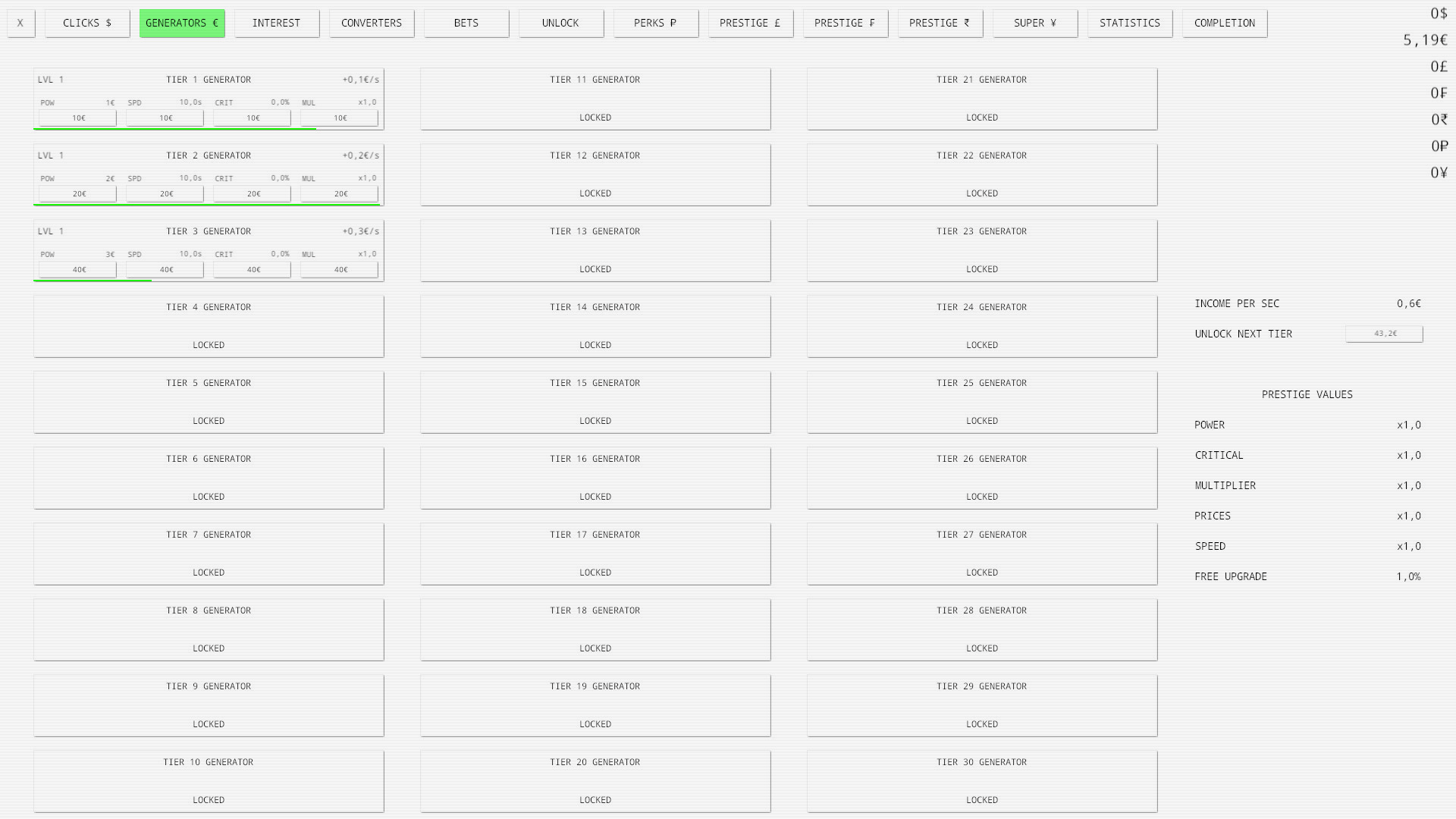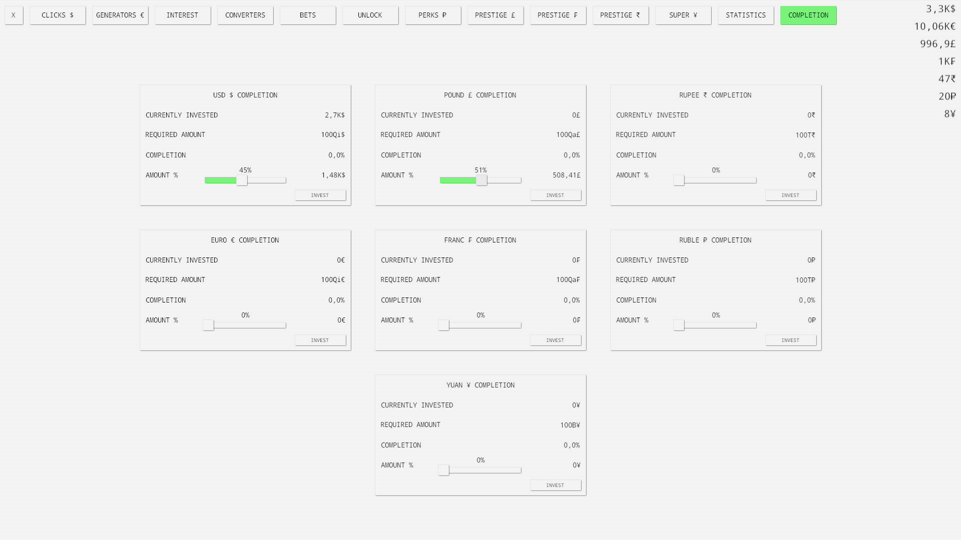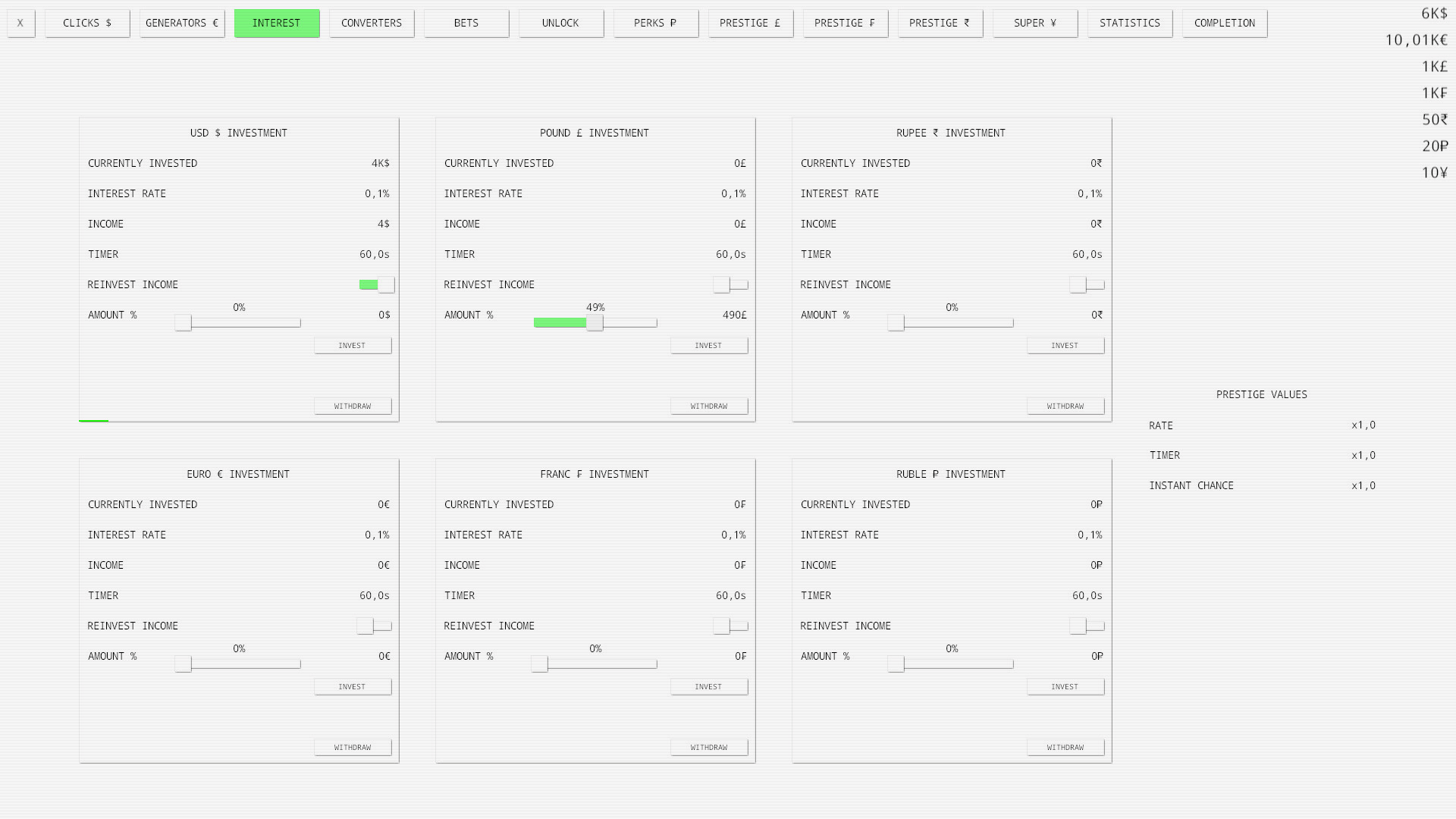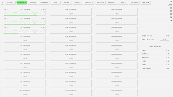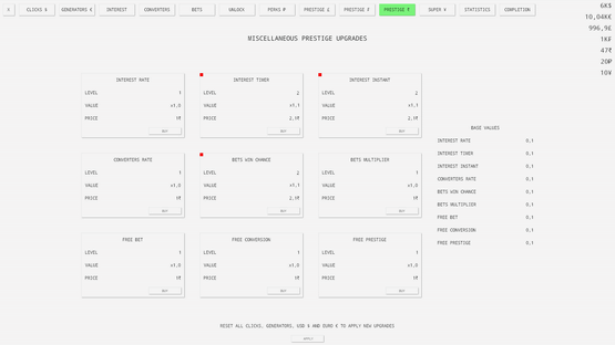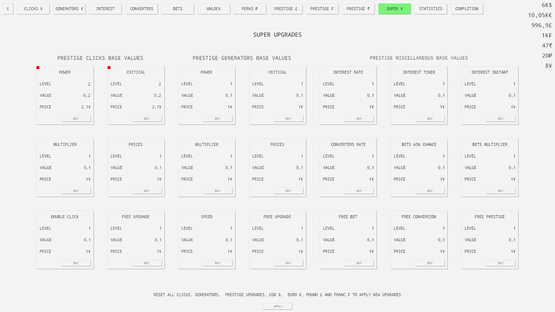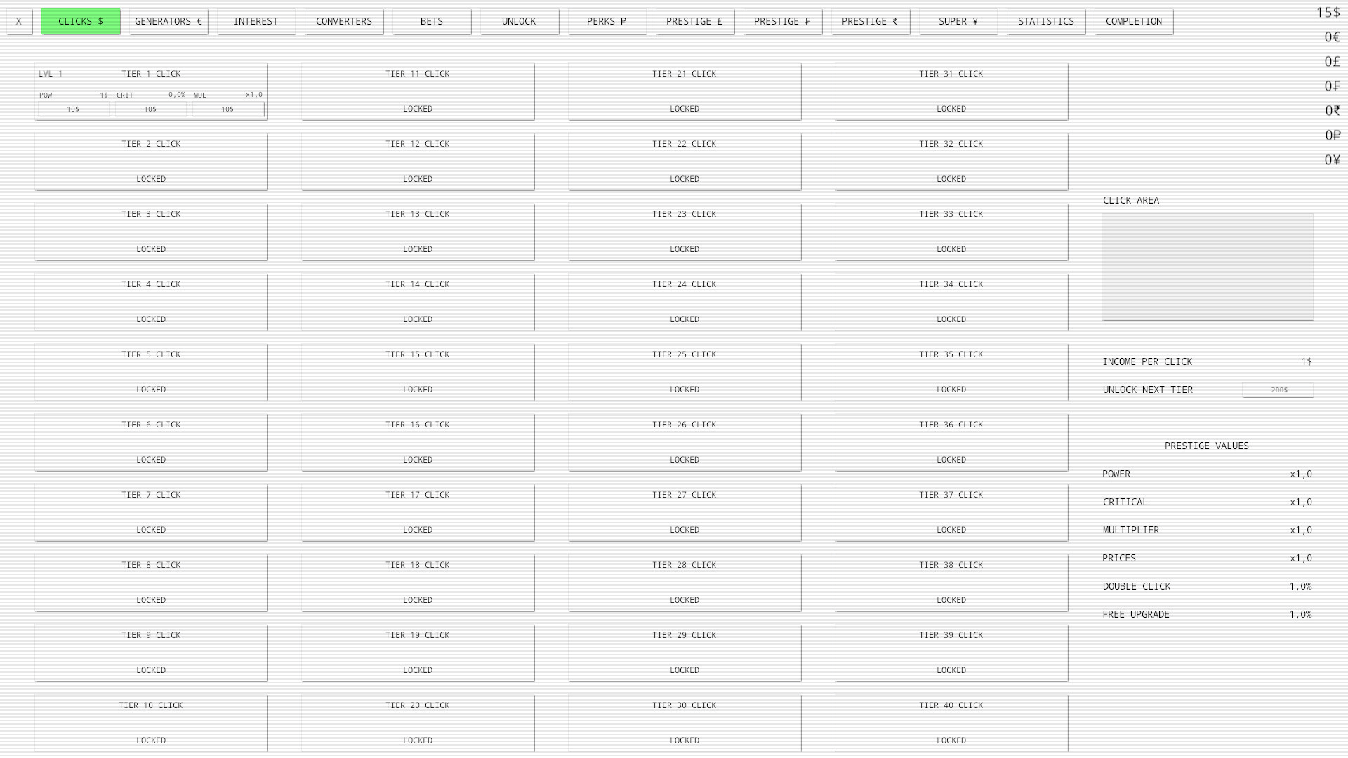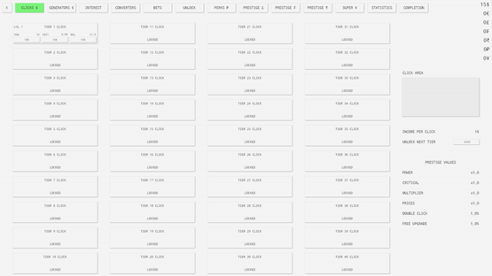 The ultimate idle clicker game with endless possibilities and infinite fun. Passive and active income, seven currencies, interest, bets, prestige, perks and many more features are available!