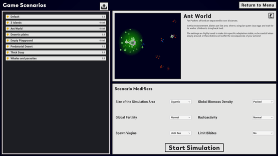 Explore real digital life in The Bibites! Play god as you guide your bibites on their evolutionary journey. Analyze their Neural Network brains and genetic information as they adapt to their environments. Save your favorites and test their strength in Challenge Mode!