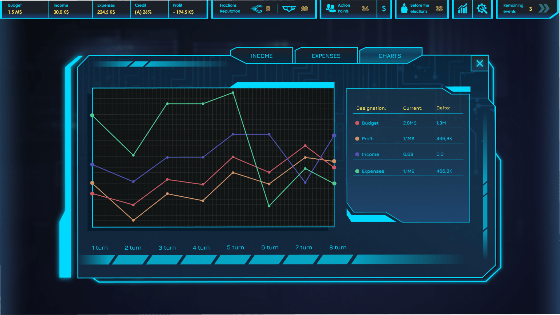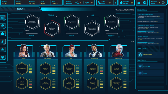 CEO Sim: Cyberpunk is an economic strategy about corporation management in the world of cyberpunk. Become the CEO of Virtual Dreams company and, under the control of the board of directors, try to maintain your power in the face of a brewing corporational war.