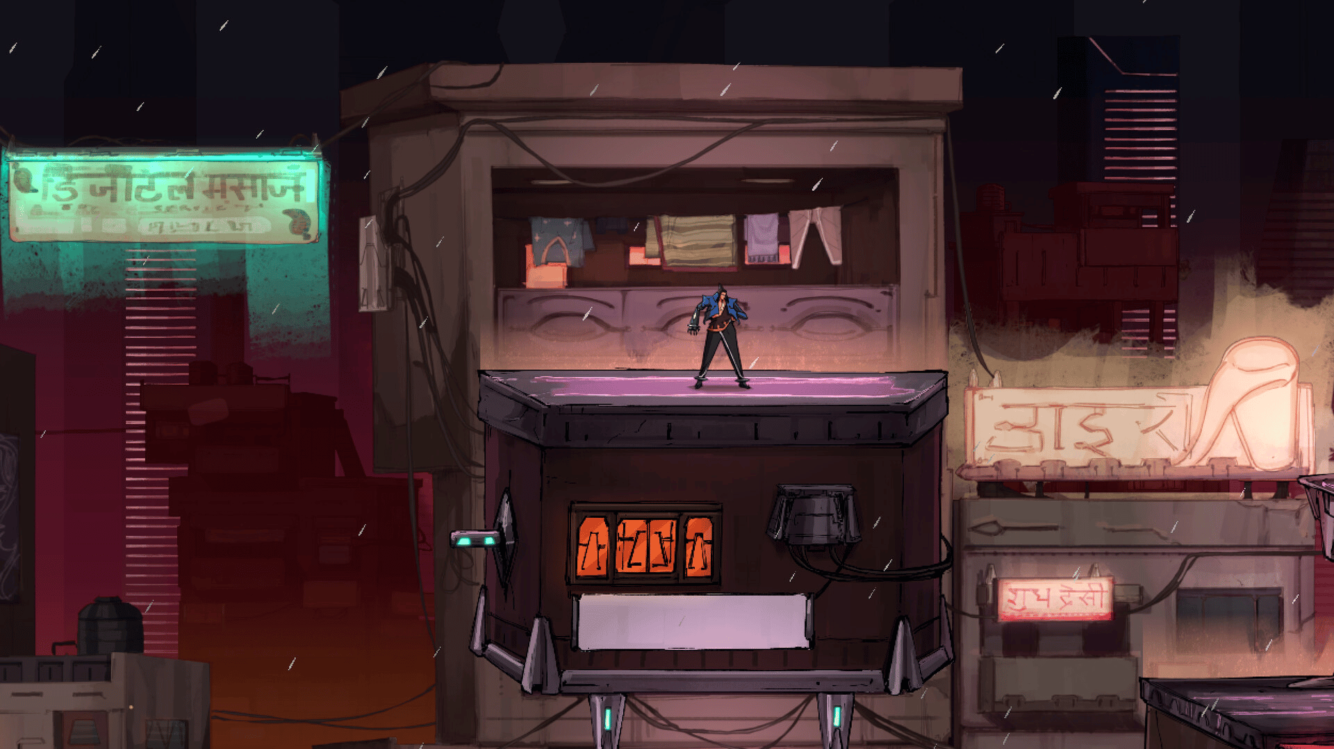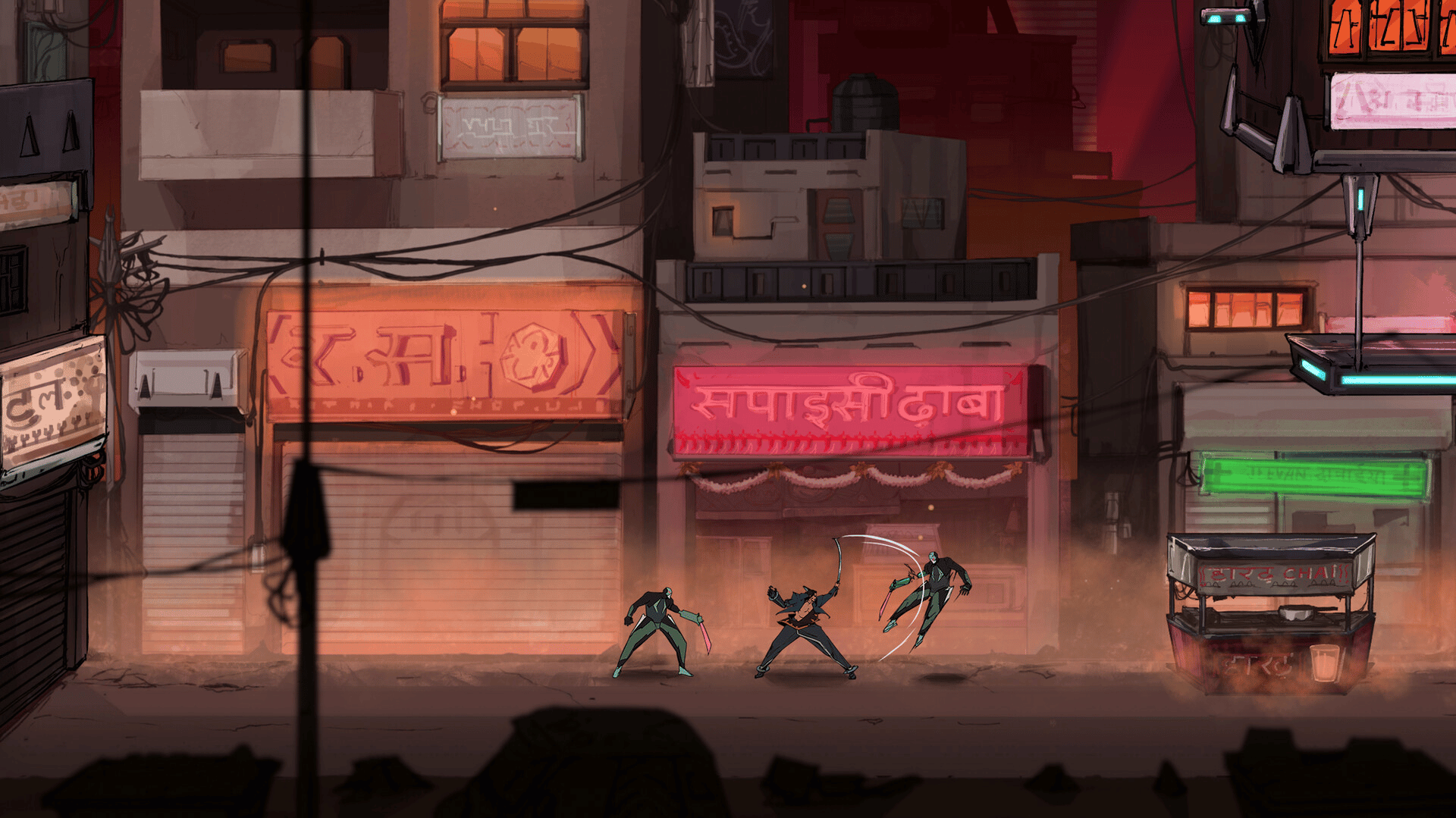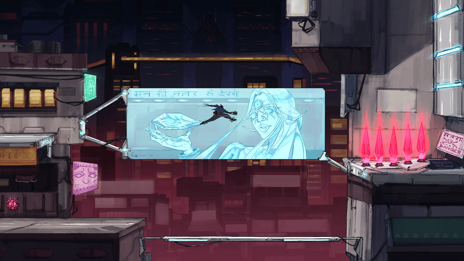 "Ghost Yantra" is a hand-drawn 2D Hack ’n' Slash Parkour game set in a branching Indian Cyberpunk city. Embark on a journey as Narak, a gun-for-hire, who after failing to stop a catastrophic event is on a quest for redemption and to fight for his freedom.