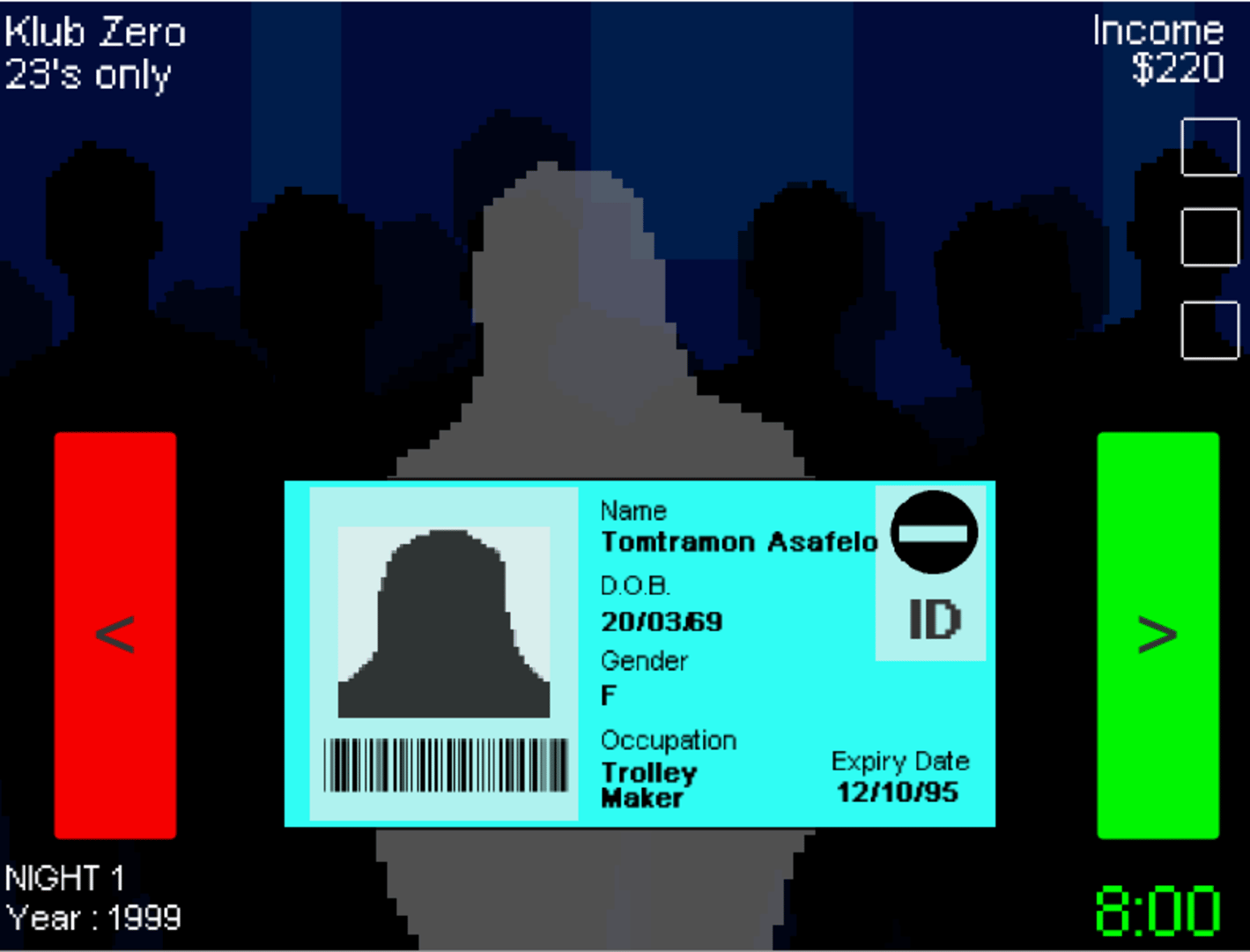A Bouncer Simulation game inspired by Papers Please where you must check ID's at the door. Look out for Drunks, Underage drinkers, Fake or expired ID's!