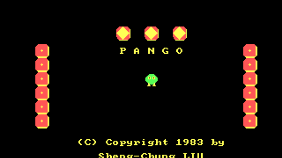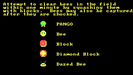 Pango is an action game released in 1983 for IBM PC/compatible computers. It is a clone of the arcade game Pengo and the gameplay is very similar. In the game, players controls Pango, a penguin like character, with the goal of clearing an ice maze of all the bees roaming around it within the one minute time limit. The maze consists of numerous ice blocks which Pango can either push around or destroy. The bees are constantly chasing the player throughout the maze and will cause Pango to lose a life if caught. The bees can be eliminated in two ways: they can either be squashed with ice blocks, or if they are near a wall that Pango is kicking the bee will become dazed allowing Pango a short time to squash it.