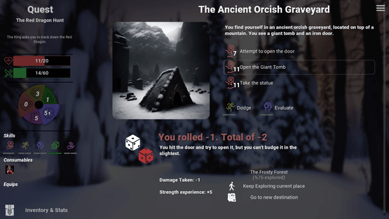 A text adventure with everything pre-generated and illustrated by AI. 100 unique stories, over 10,000 events, several thousand items, narrated story, AI-generated music, and progression between runs.
