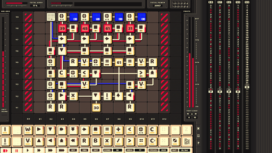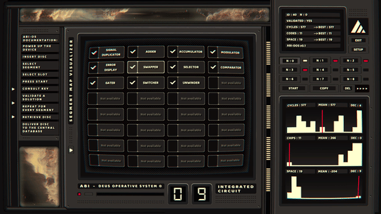 ABI-DOS is an open-ended assembly puzzle game. You are asked to design circuits using a fictional programming language to solve problems that require a great deal of creativity and logic.