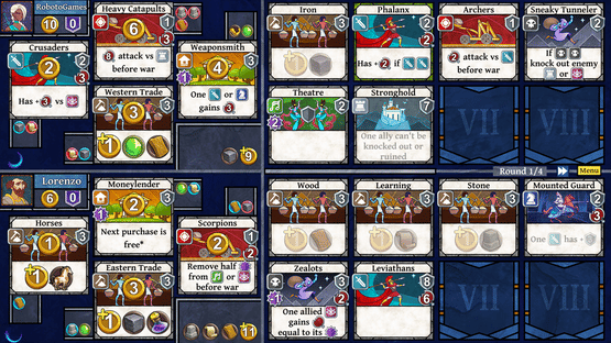 Deep civilization-building strategy in a fast-paced card game! There are many paths to victory in this competitive card drafting game featuring 12 unique characters and hundreds of cards ranging from great pyramids and war elephants to sneaky spies and crafty merchants. Perfectly balance your city’s culture, military and economy to outwit your opponent and win!