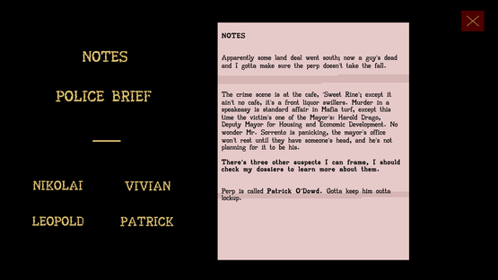 Play as a corrupt detective on the mob’s payroll, and cover up their crimes. Read files, collect information and obscure evidence to frame an innocent bystander, who was at the wrong place, at the wrong time. After all, crime pays.