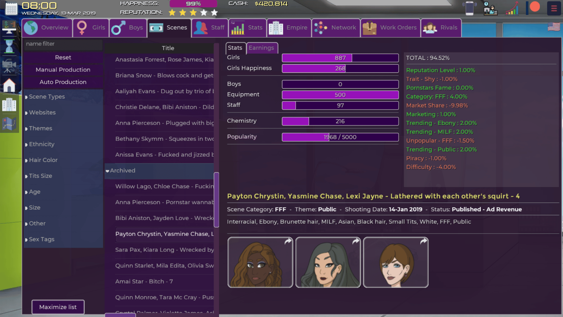 Porn Empire is a 18+ business management game where you take the roll of an amateur porn producer and work your way to the top. Create your character, level up your attributes, pick up new models and train them, build studios, hire staff, create websites and try to run a successful business.