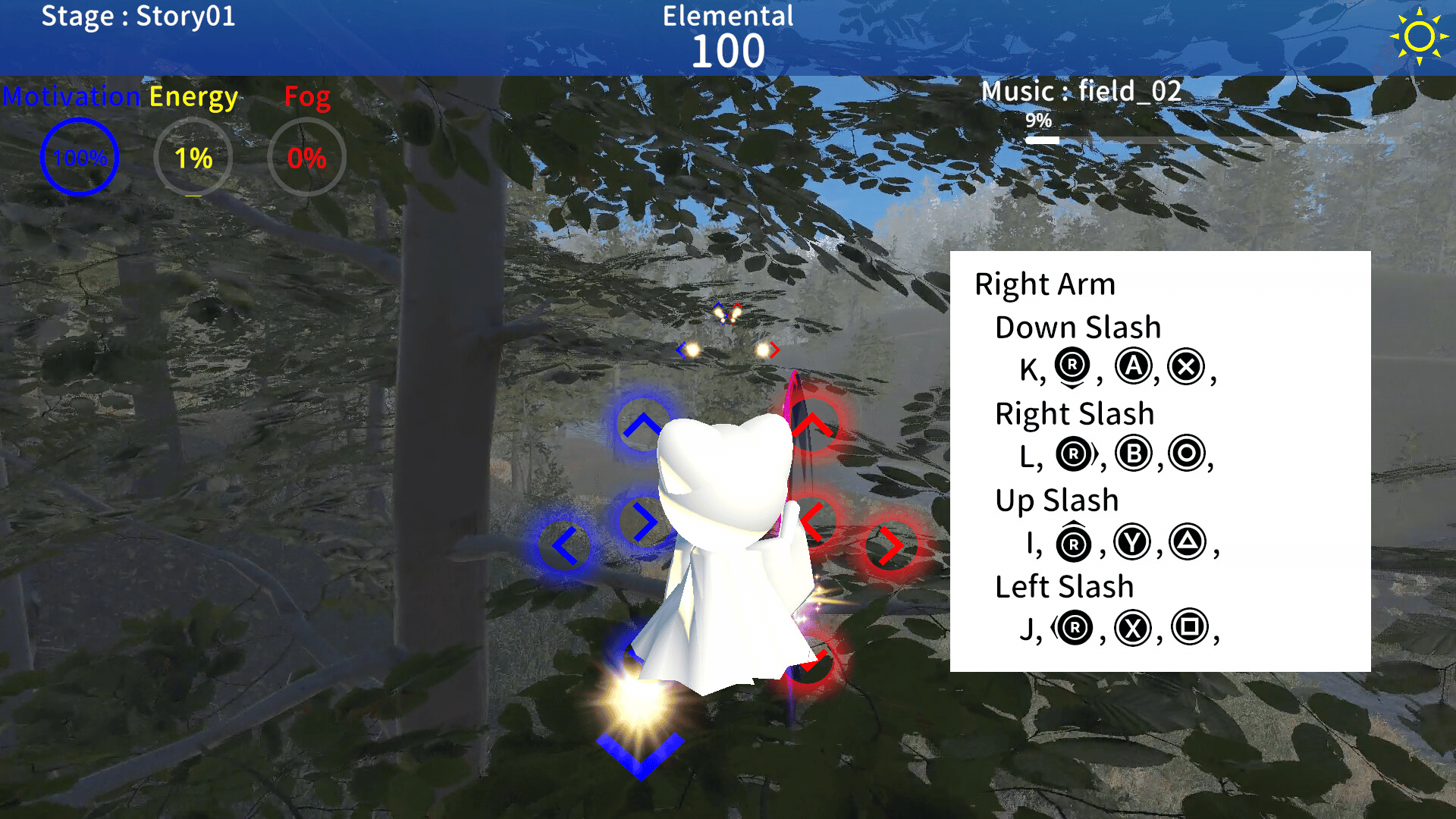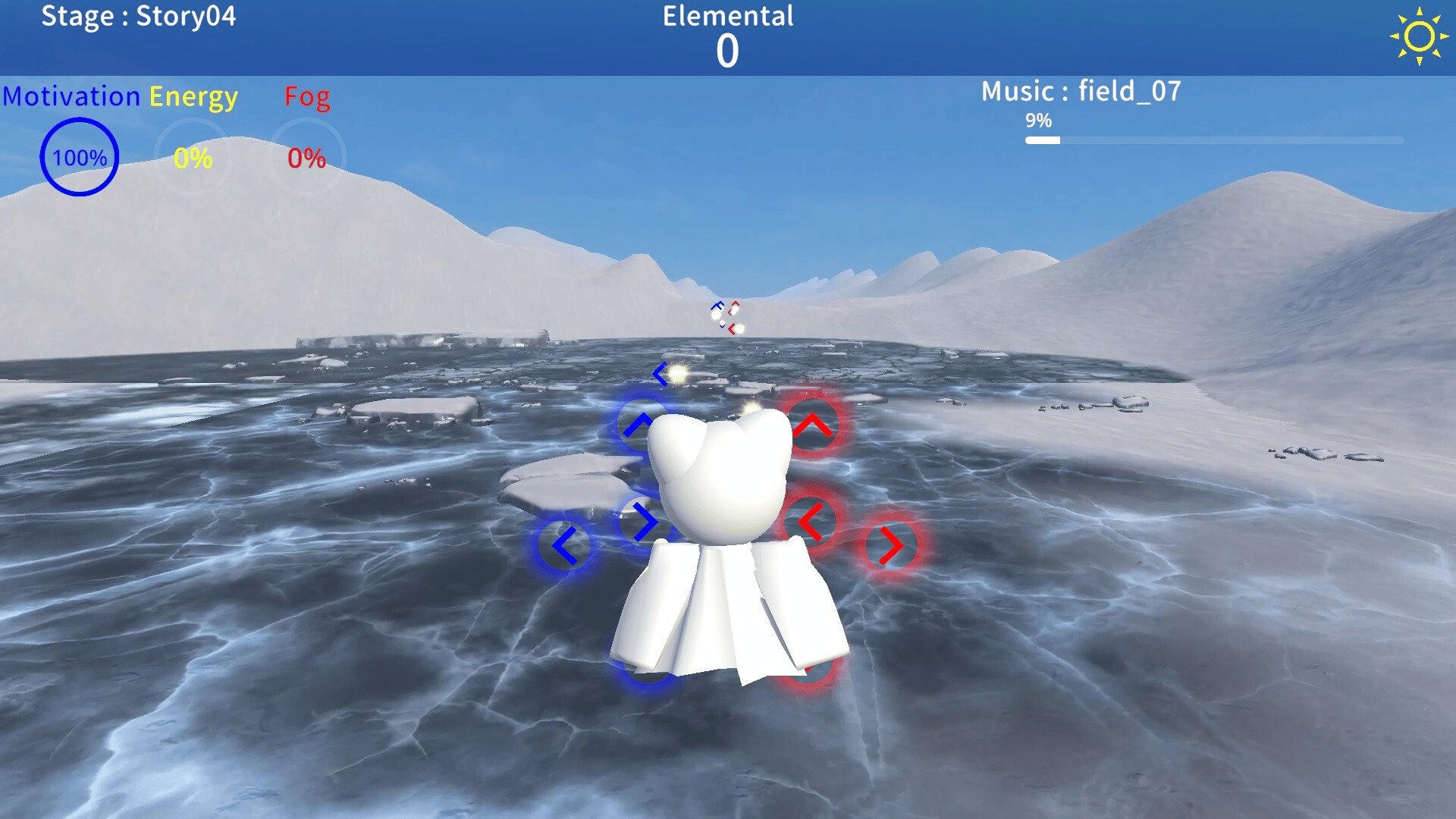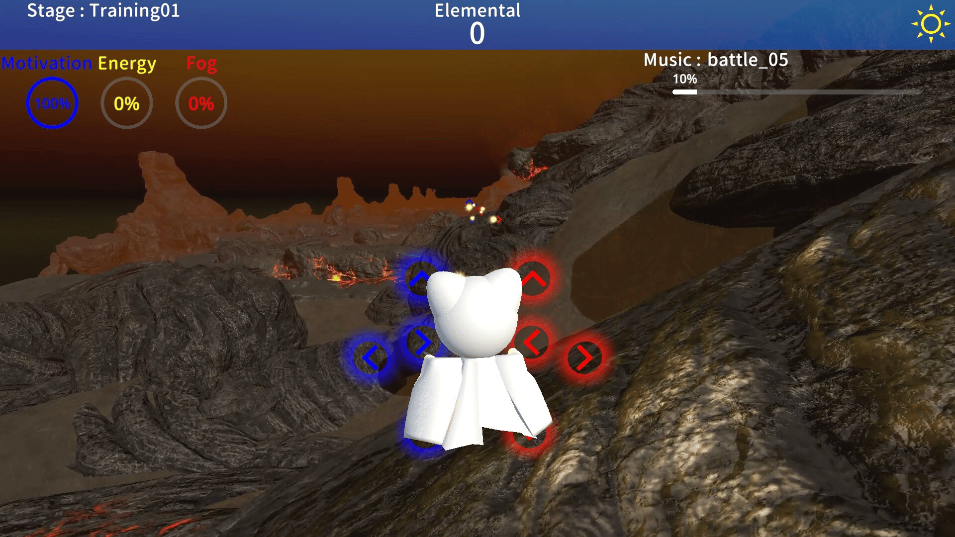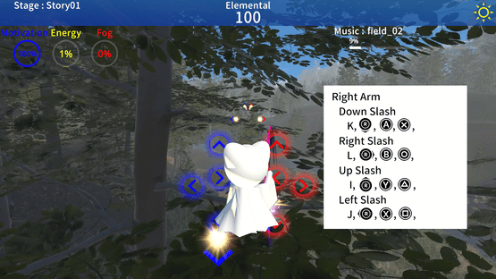 Terunyan to Amanoiwato is a rhythm game in which Terunyan wanders around and collects elementals. Elementals can be efficiently gathered by collecting them in rhythm to the music.