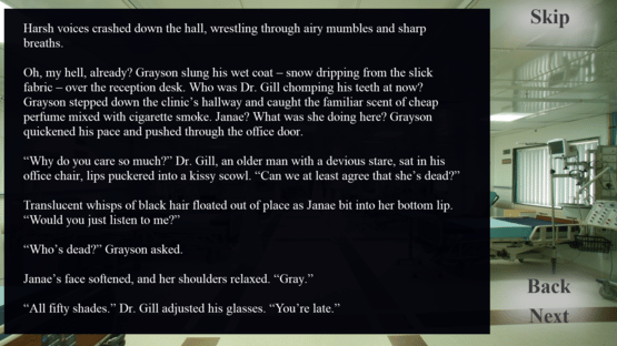 The Sleeping Sickness is an interactive short story that allows the player to guide the main character's actions. Each day, the player chooses where Grayson investigates. The player’s choices will lock and unlock future locations, change dialogue, and alter the story. Choices matter in The Sleeping Sickness. While The Sleeping Sickness includes sounds, graphics, and interactive sections, it focuses on the story. The game is designed to play like a choose-your-own-adventure book and is an excellent choice for horror fans, avid readers, and lovers of creepy pastas.