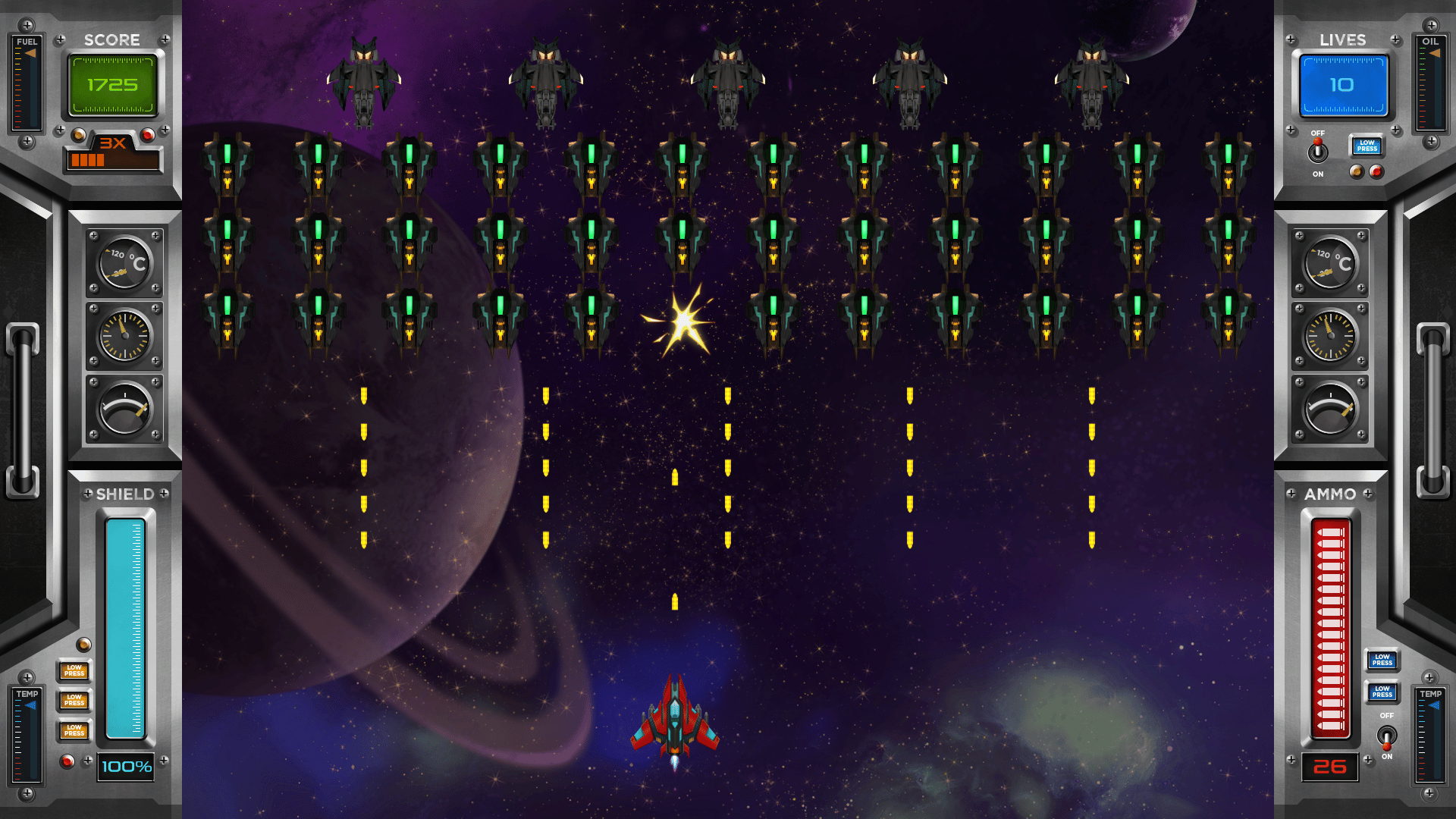 Retaliate is a vertically scrolling space shooter with the unique gameplay mechanic being that the player starts with no ammo. Instead the player has a shield and is able to use it to both destroy enemies and absorb their weapons. Absorbed weapons can then be fired by the player.