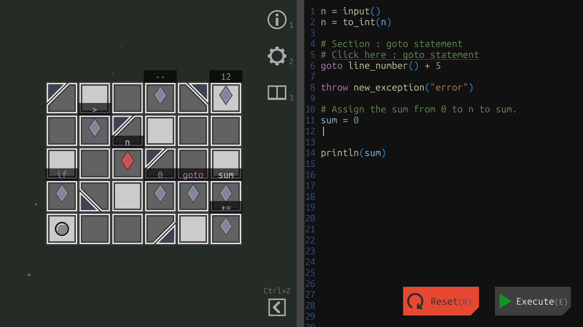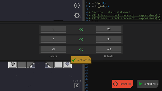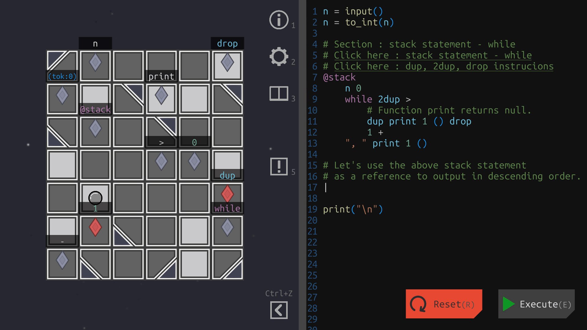 Pick up the tokens, write the source code, and repair the data that your doctor has deleted! Write source code that achieves the input and expected output pairs set for each stage. The code is written in tolerance, a dedicated language.