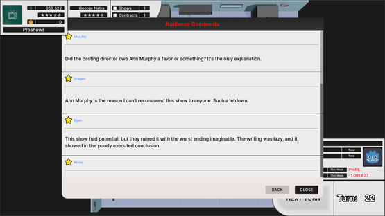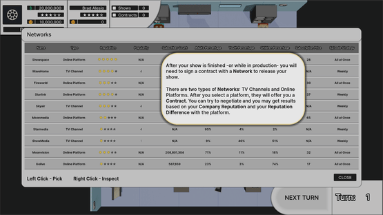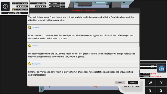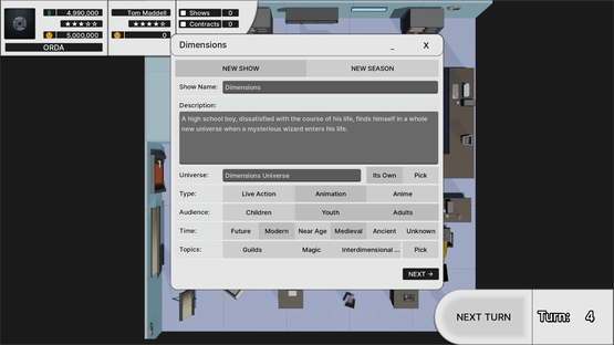Get in charge of your own TV Show Company in this text-based tycoon game! Have you ever thought of your own TV Show? Design your dream shows down to the small details. Release your shows and witness your audience comment on your design choices! Make money and release more shows and seasons!