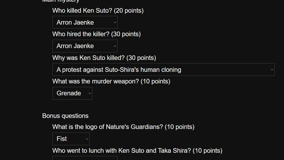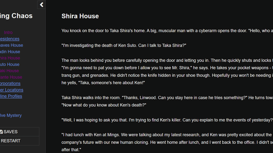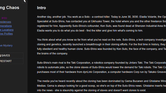 Another day, another job. You work as a Solo - a contract killer. Today is June 30, 3030. Eladia Volante, the Operations Specialist at Suto-Shira, has contacted you at Gikhusko Tower, the hotel where you and the other freelance Solos are registered for hire. Apparently Suto-Shira's cofounder, Ken Suto, was found dead at Shenzen Industrial Area this morning. Eladia wants you to do what you do best - find the killer and give him what's coming to him.