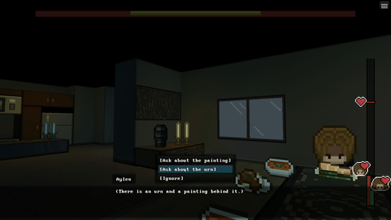 A young adult, Aylen, is an online personality who loves horror games. As she was shooting the intro for her next Let's Play, her biggest fan kidnaps her. There are only two means for escape: examine the area and begin plotting, or try your charisma and get an edge over him.