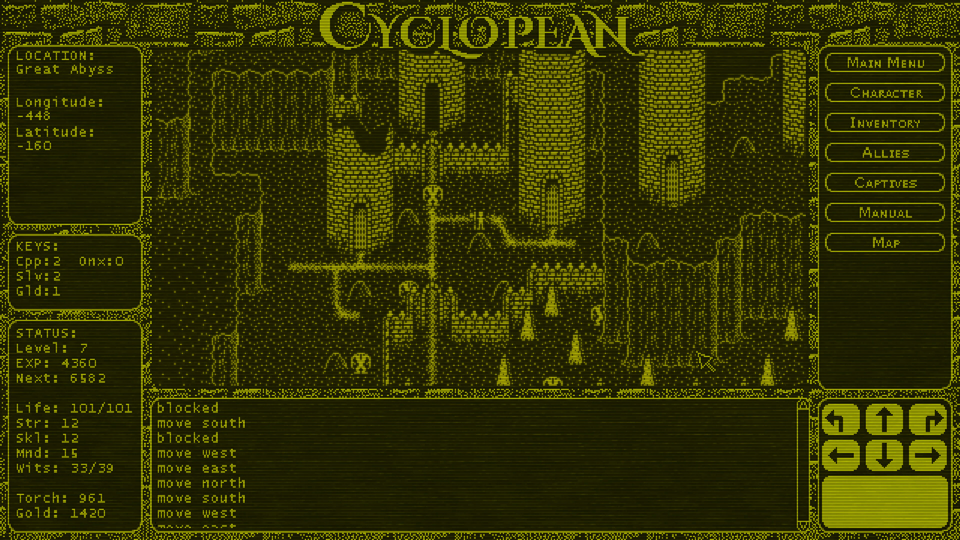 Cyclopean: The Great Abyss is a small scale, mechanics driven CRPG/Roguelike in a retro, monochromatic style, that takes place in the underworld of H.P. Lovecraft's Dreamlands.