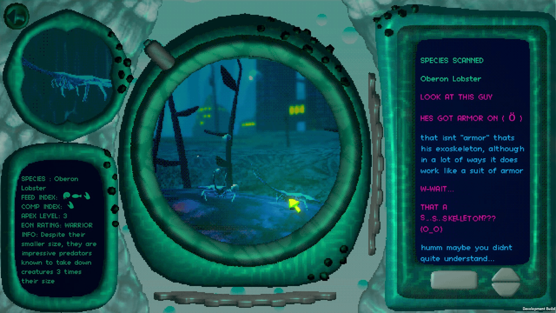 Panthalassa is a Point and click and visual novel set in an underwater alien world. You play as an AI trying to uncover the memories of their body's previous owner. The game makes you experience the world through different user interfaces, where the physical and digital worlds collide.