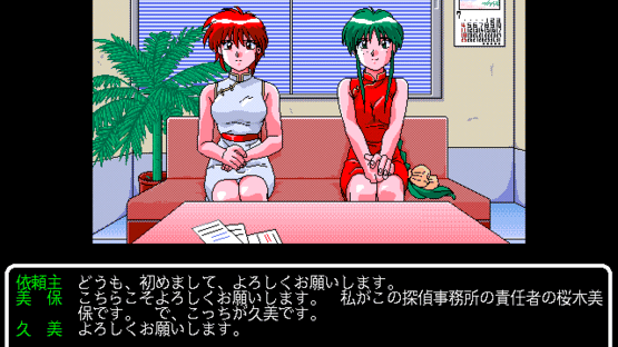 Viper V-6 is the first in the long-running Viper series of animated adult games. It contains three separate stories:The Devil Came* tells the story of a teenager named Ogawa, who was unpopular in his class and summoned a demon to exact revenge. But the demon turned out to be female, so his wishes naturally assume a different direction... Afternoon describes a scene during a beauty contest. The defeated participant thinks that she was unfairly judged, but her fury at the winner turns, in front of the amazed spectators, into erotic desire... Double Impact features two young female detectives, Miho and Kumi, who pretend to search for jobs as maids in order to infiltrate a mansion in which mysterious disappearances have been taking place. All the three stories are very short and can perhaps be better described as "scenes"; the entire game can be completed within several minutes. The interaction is reduced to absolute minimum, with an occasion decision to make, and is available only in The Devil Came (in which it is also possible to die if the player makes a wrong decision); the two other stories are non-interactive, the only input being pressing the return key to advance to the next scene. What sets "Viper V-6" (and the whole series) apart from most other Japanese adult games - beside the "three stories in one" concept - is the fact that most of its sex scenes are animated.