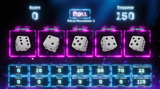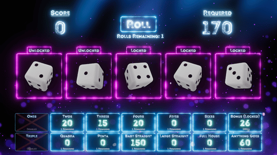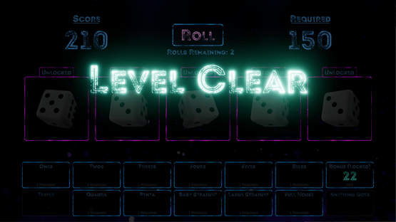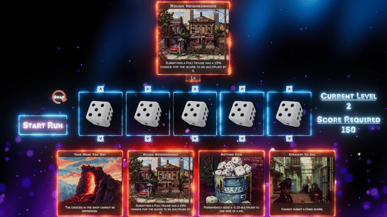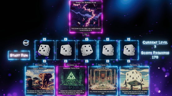 Rogue Rollout is a roguelike deckbuilder where you score points in a Yahtzee-style dice game, choose powerful artifacts, and face challenging impairments as you push through endless levels.