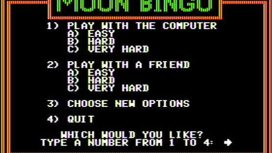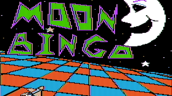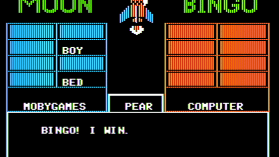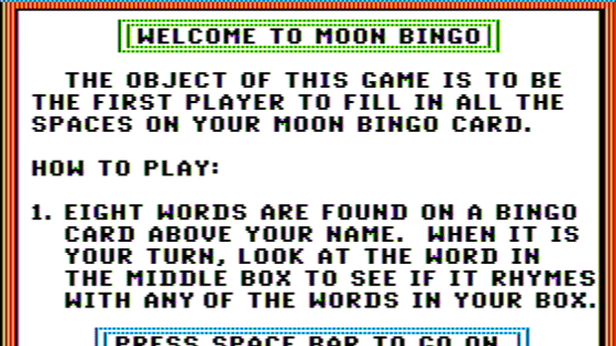 Moon Bingo is an educational game about rhyming words. The player and their opponent try to fill in a 2x4 bingo card by matching rhyming words. Each space contains a word, and a word appears in the middle of the screen. If the player has a rhyme to the displayed word, they need to type in the correct rhyme from their board, and that space is taken. If there is no rhyming match, the word should be passed on to their opponent for a chance to score. The first player to fill their board wins. The game allows for single-player versus computer or two-player games with three separate levels of difficulty.