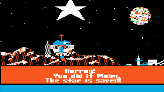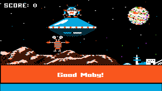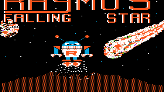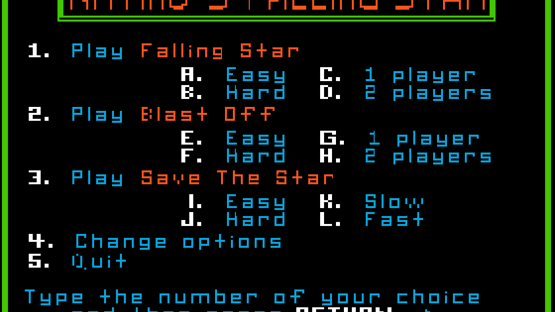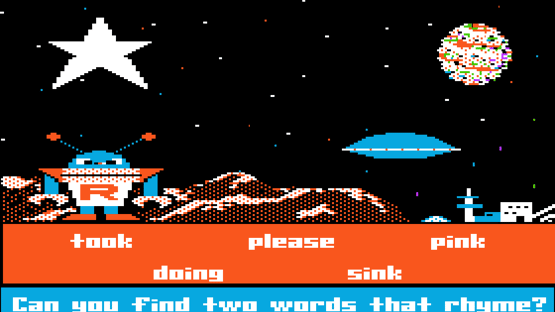 Rhymo's Falling Star is 1 - 2 player educational word game for the Apple II. Players compete in 3 slightly different challenges, where they must type matching rhyming words. In each challenge, the player must complete a total of 15 rhyming words to either help Rhymo catch a falling star, save creatures from a dying planet, or reach his spaceship. Each challenge contains 2 different difficulty levels. At the easier level, the player must type the two words that rhyme. At the harder level, the player is given a word with the first letter missing, and the player must choose 2 of 5 letters that will complete this word. As the player successfully answers questions, they get closer to their goal of helping Rhymo.