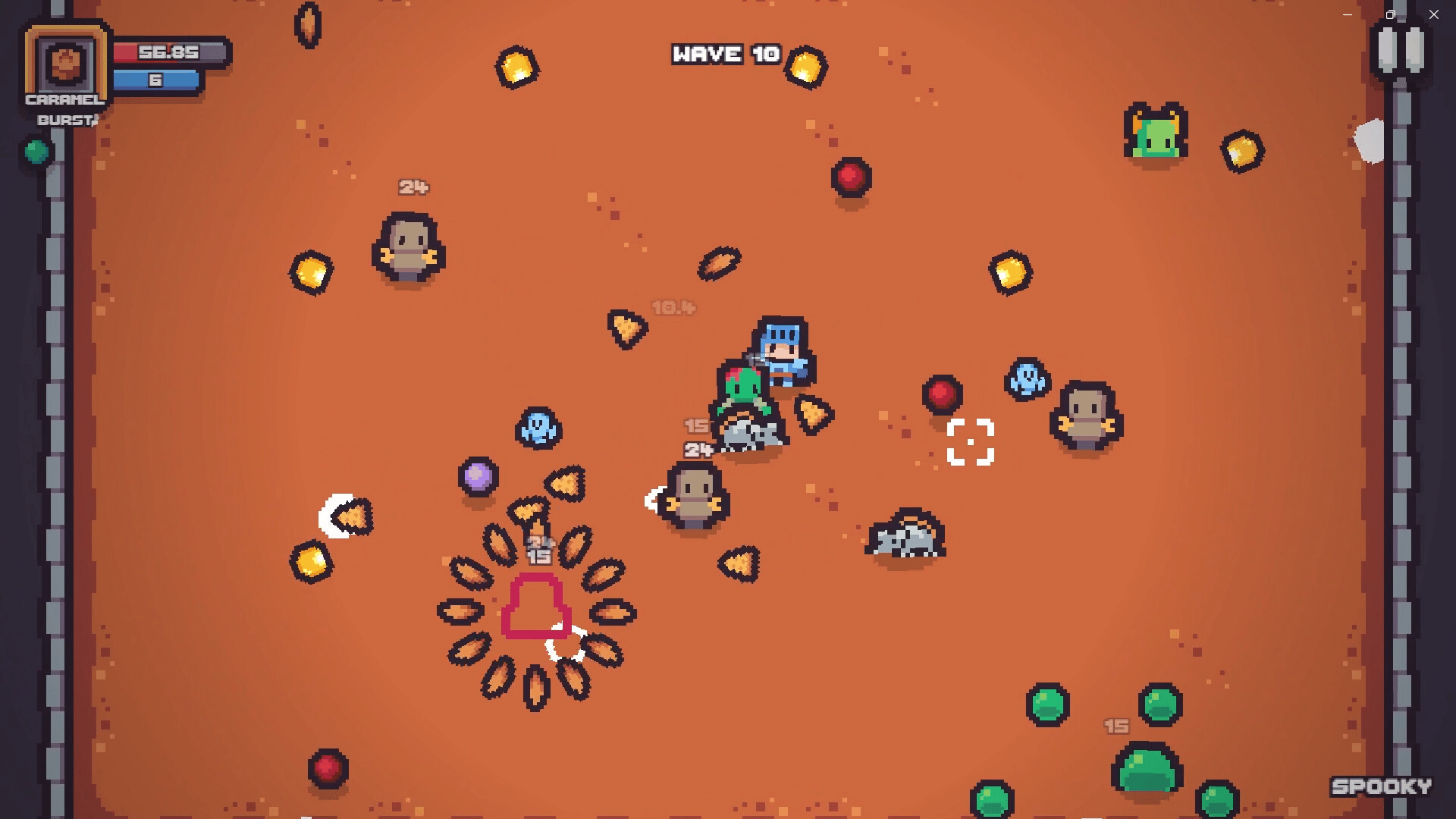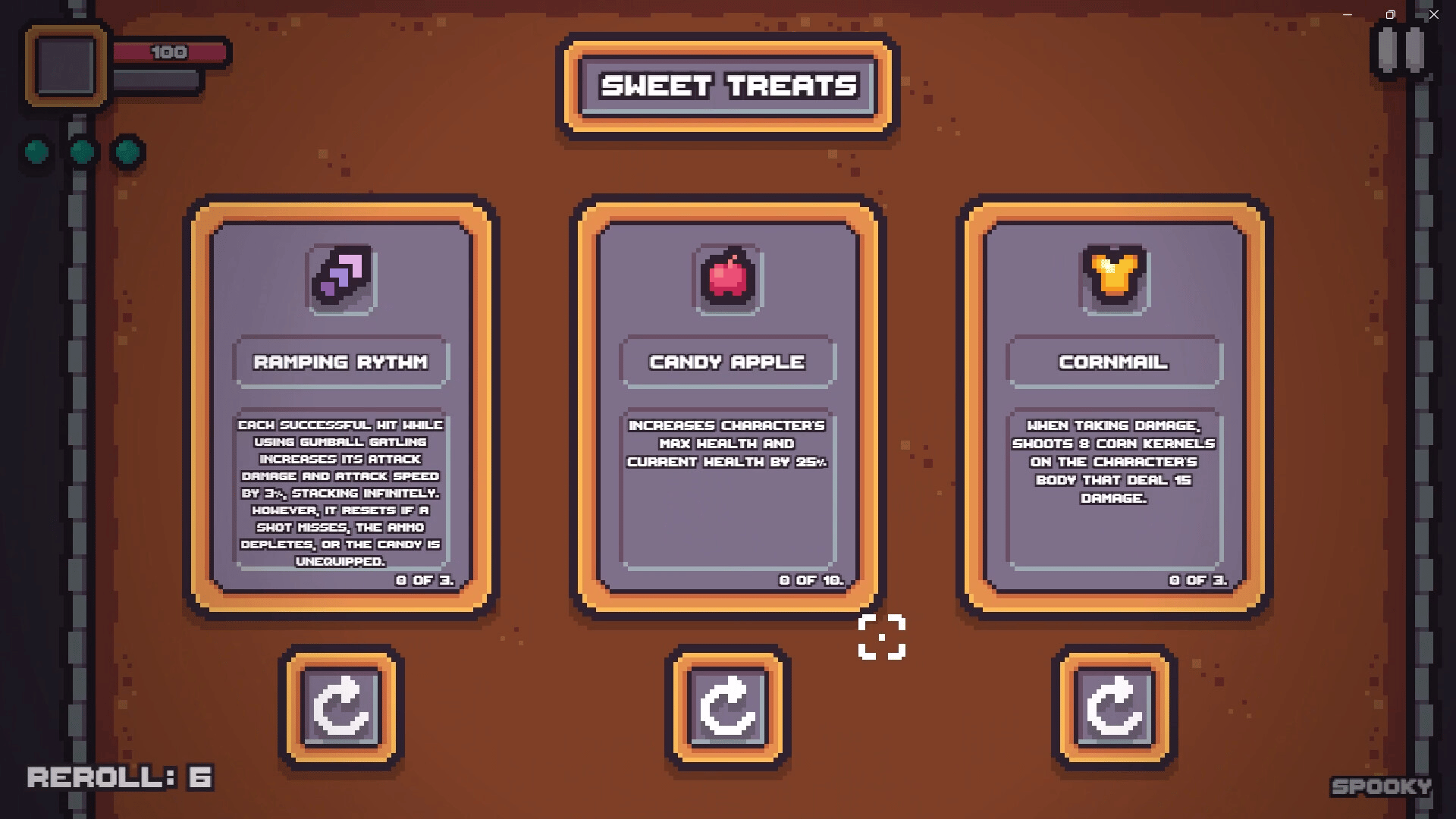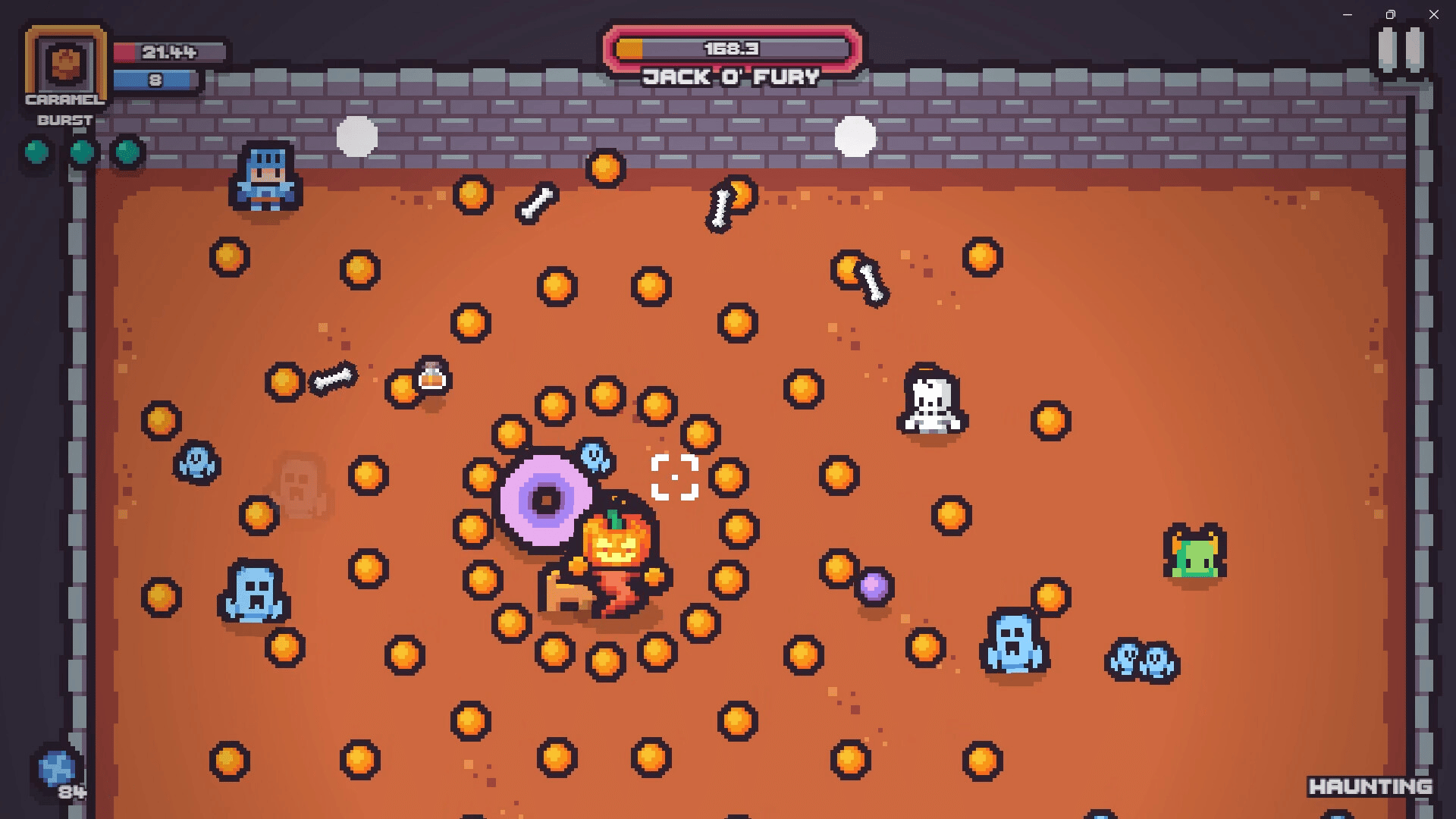 Rogueween is a roguelike, bullet hell, top-down arena shooter game where candies grant shooting abilities, treats provide power-ups, tricks offer extra challenges, and you battle waves of Halloween-themed enemies in this action-packed adventure!