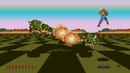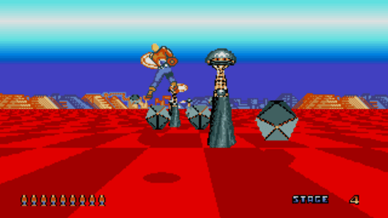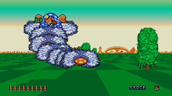 The Amiga Port of "Space Harrier". Space Harrier on the Amiga is a port of Sega's classic rail shooter. Players control a jetpack-equipped protagonist who flies through surreal, colorful landscapes, battling bizarre enemies and large bosses. The game features fast-paced action as the hero weaves through obstacles and projectiles while firing at incoming threats. While adapting the arcade original to home computer hardware, this version aims to recreate the high-speed, fantastical experience of the original within the Amiga's capabilities.