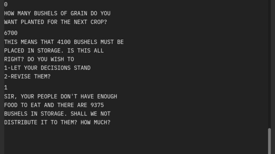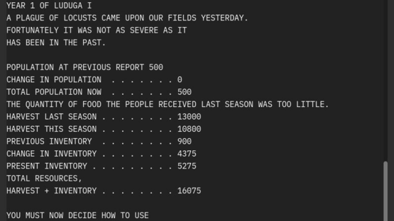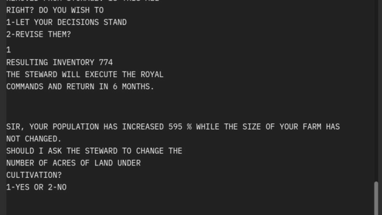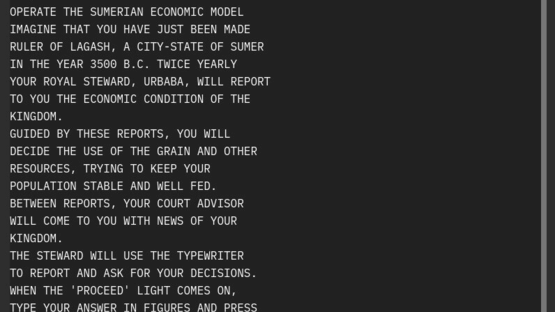 A game of strategy and management. The Sumerian Game is one of the earliest computer games. Developed and programmed between 1963 and 1965, it was designed to teach children math, economy and ancient history. The source code was lost but now you can play it again.