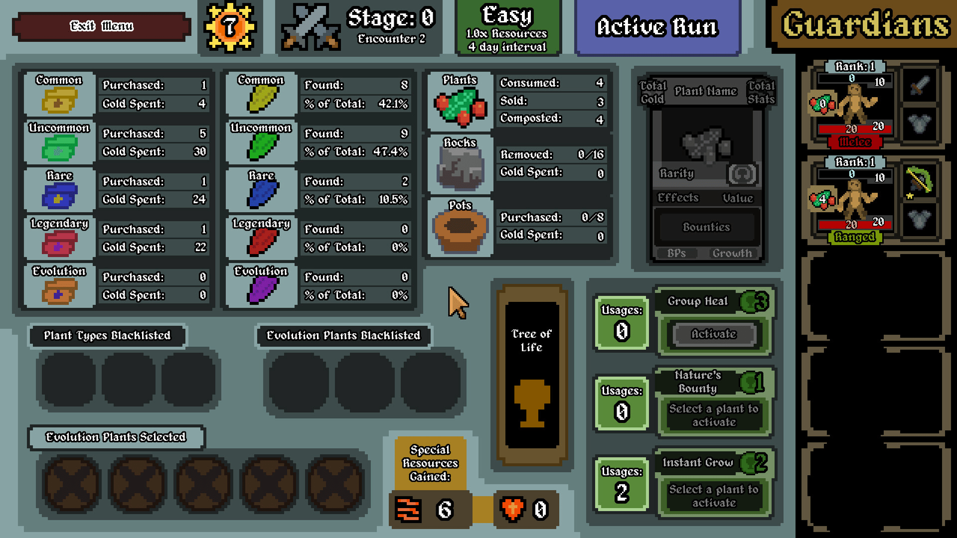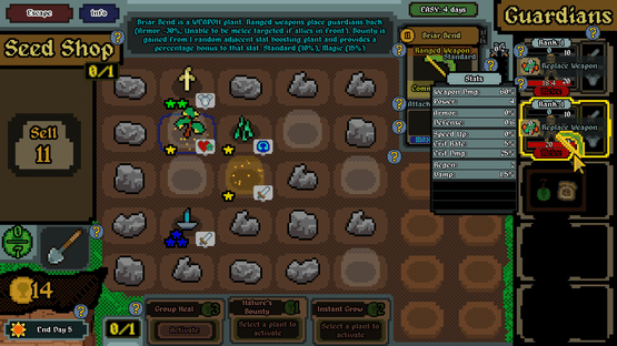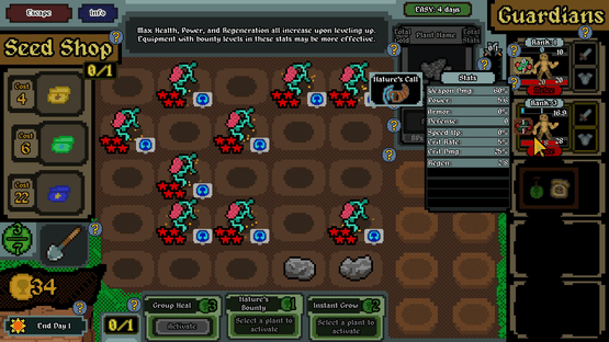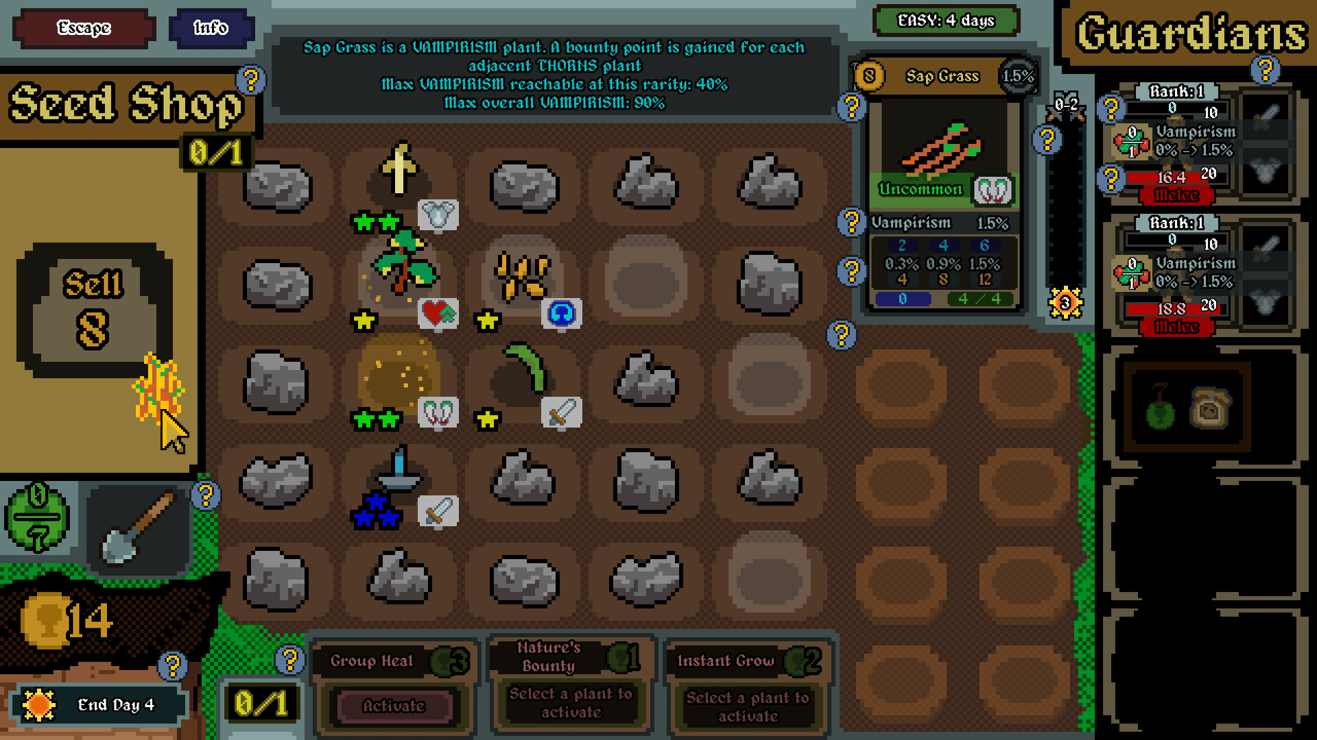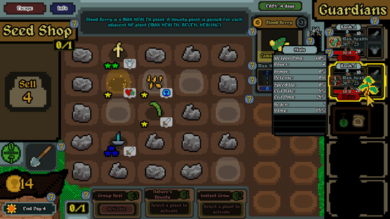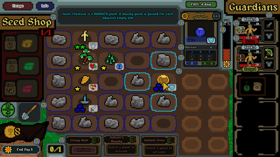 A fantasy turn based strategy game about growing plants. Position plants strategically for the best results. Sell plants to buy seed packets. Compost plants to gain grove energy to fuel powers. Feed plants to guardians to make them strong enough to fight off the corruption in auto-battling format.